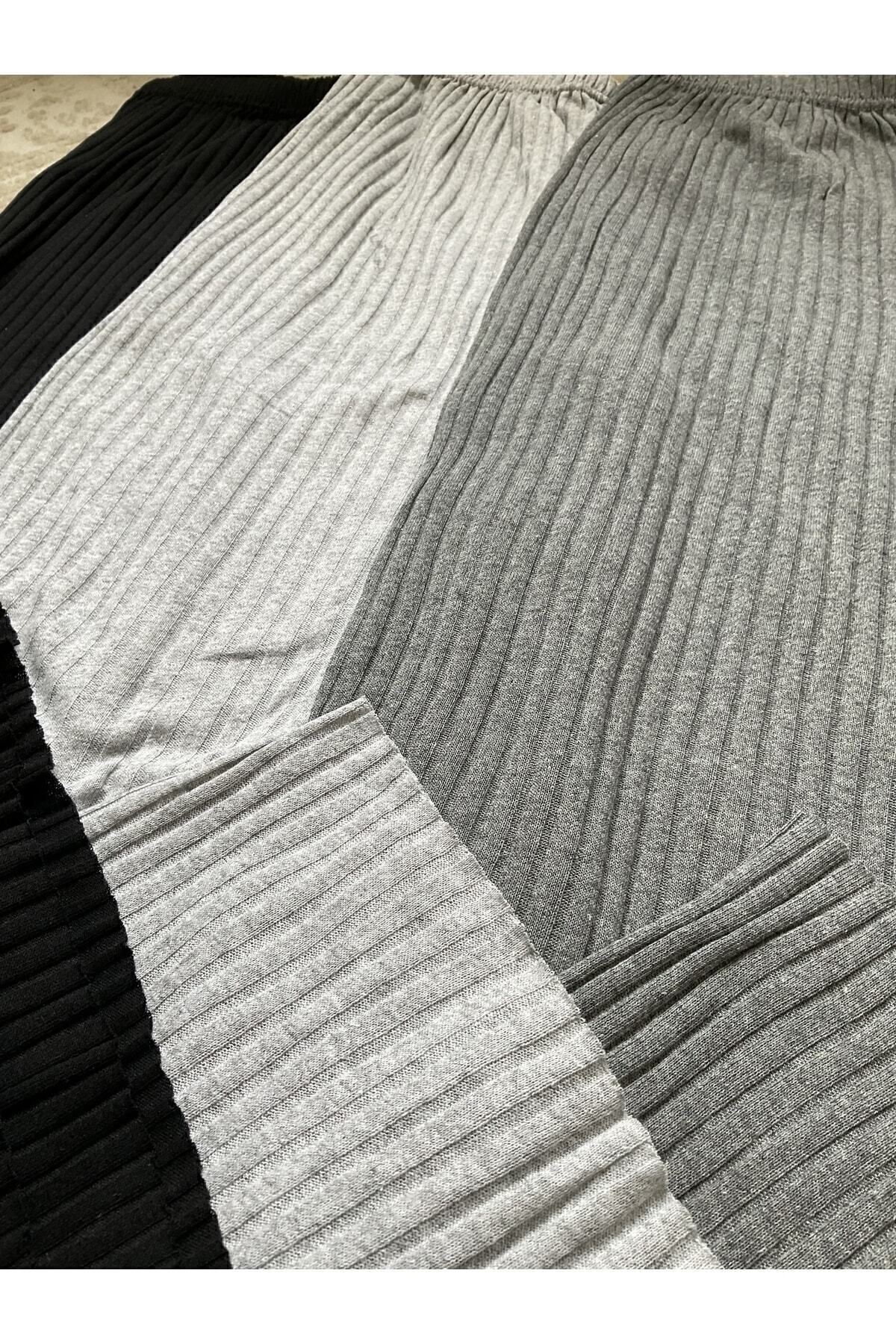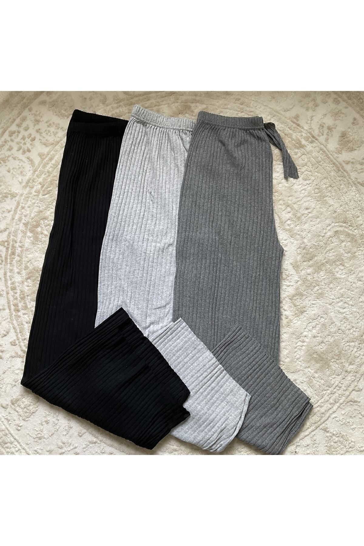 Üç farklı renk seçeneğiyle (siyah, gri ve füme) her zevke hitap eden geniş bir yelpazede sunulan bu kadın fitilli pantolon ve eşofman takımı, günlük kullanım için idealdir.; Normal bel tasarımı sayesinde rahat bir oturuş sağlar ve tüm gün konforlu hissetmenize olanak tanır.; Homewear koleksiyonunun parçası olan bu ürünler, evde geçirilen zamanlarda da şıklığından ödün vermeyen kadınların tercihi olur.; Geniş paça tasarımı ile modern ve trend bir görünüm sunarken, standart boy paça uzunluğu her bedene uyum sağlayacak şekilde üretilmiştir.; Düz kesimi sayesinde vücut hatlarını saran ancak sıkmayan bir yapıda olan bu eşofman altları, günlük giyimde rahatlıkla tercih edilebilir.; Gri renk seçeneğiyle kolayca kombinlenebilen bu pantolon ve eşofman takımı, her gardıropta bulunması gereken temel parçalardan biridir.; 5% likra karışımıyla esneklik kazanan bu ürünler hareket özgürlüğünüzü kısıtlamaz.; Çizgili deseniyle klasik ve zamansız bir görünüm sergileyen bu fitilli pantolon ve eşofman takımı, her ortamda şıklığınızla fark edilirsiniz.; Beli lastikli ek özellik sayesinde vücudunuza mükemmel uyum sağlayan bu eşofman altları, tüm yaş gruplarına hitap eder.; Pamuk, polyester ve elastan karışımından üretilmiş olan bu ürünler uzun süreli kullanım vaat ederken, basic silueti ile her bedene uygunluk gösterir.;