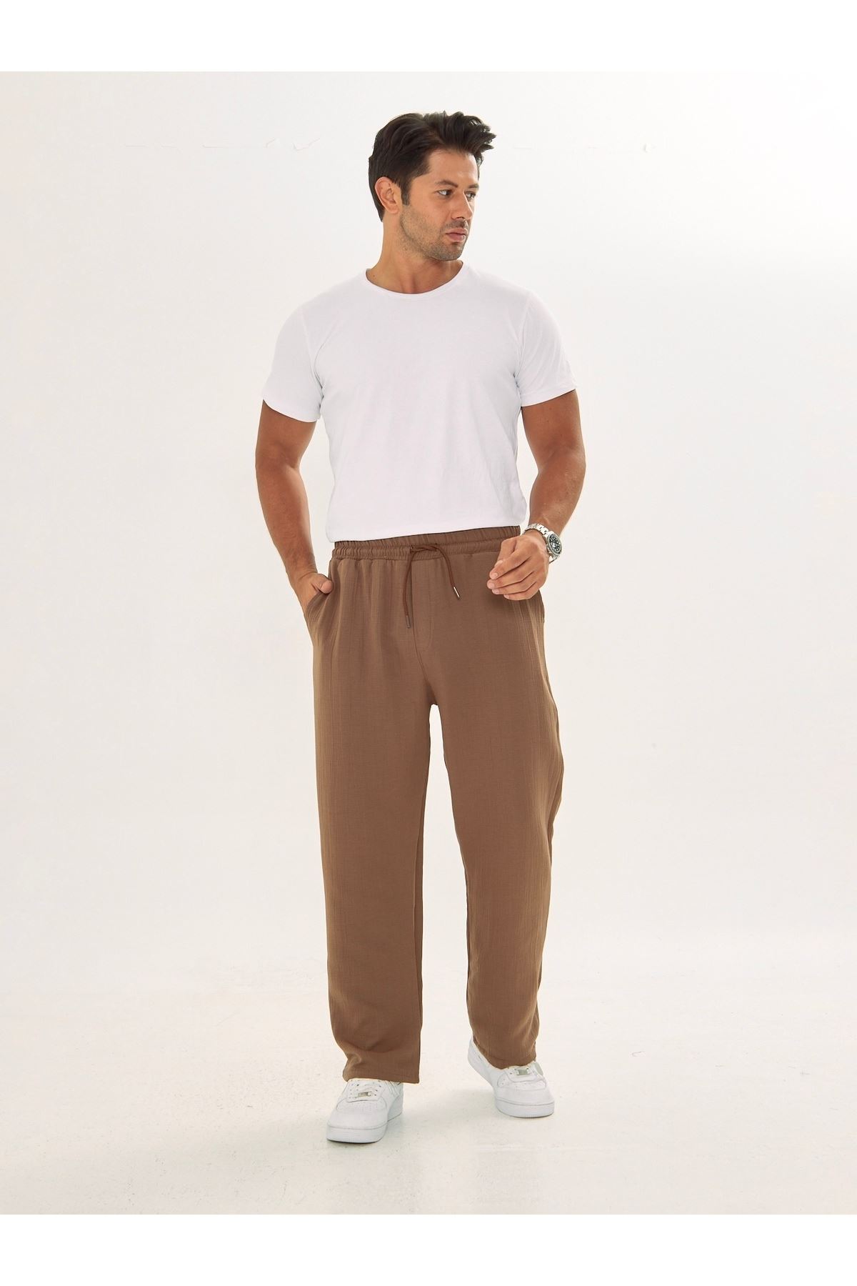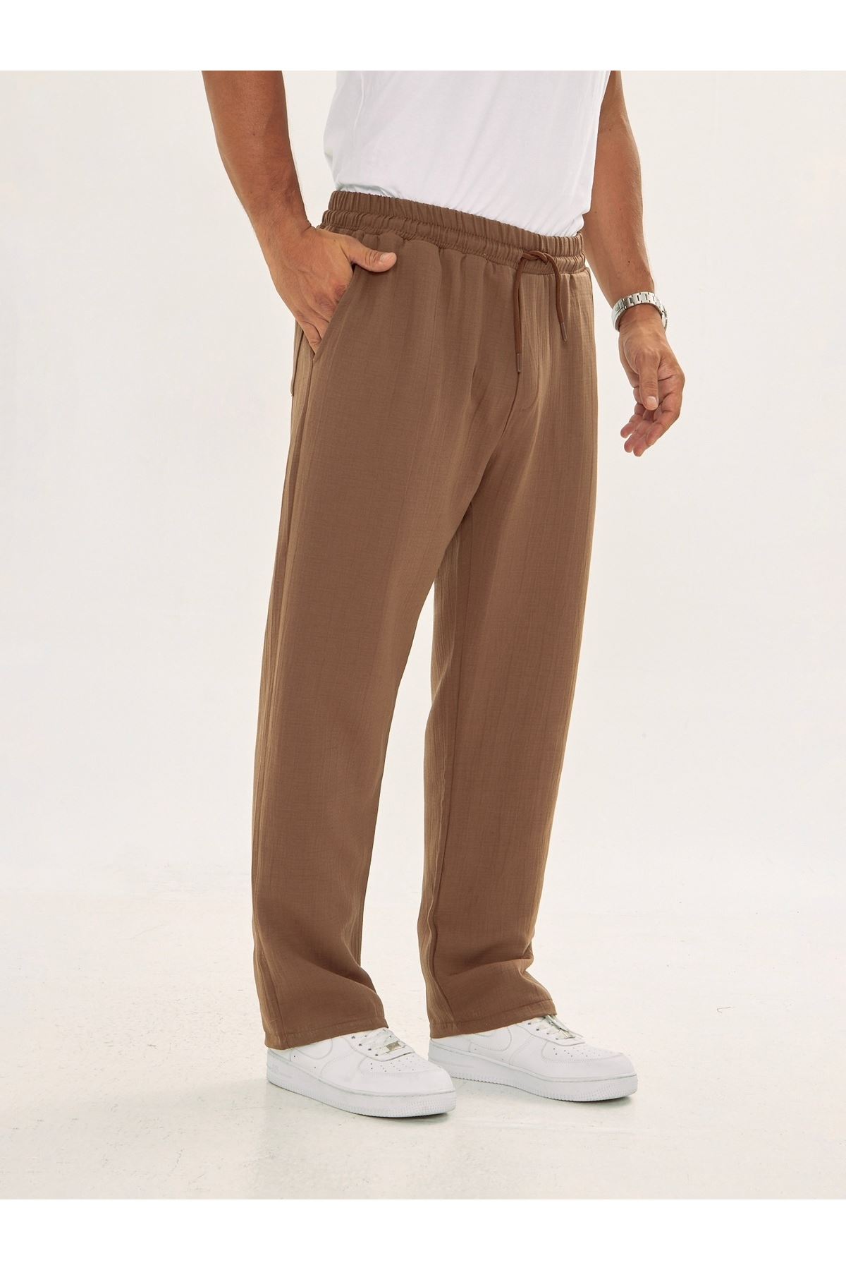 Erkek Baggy Müslin Keten Bel Bağcıklı Lastikli Düz Paça Pantolon
