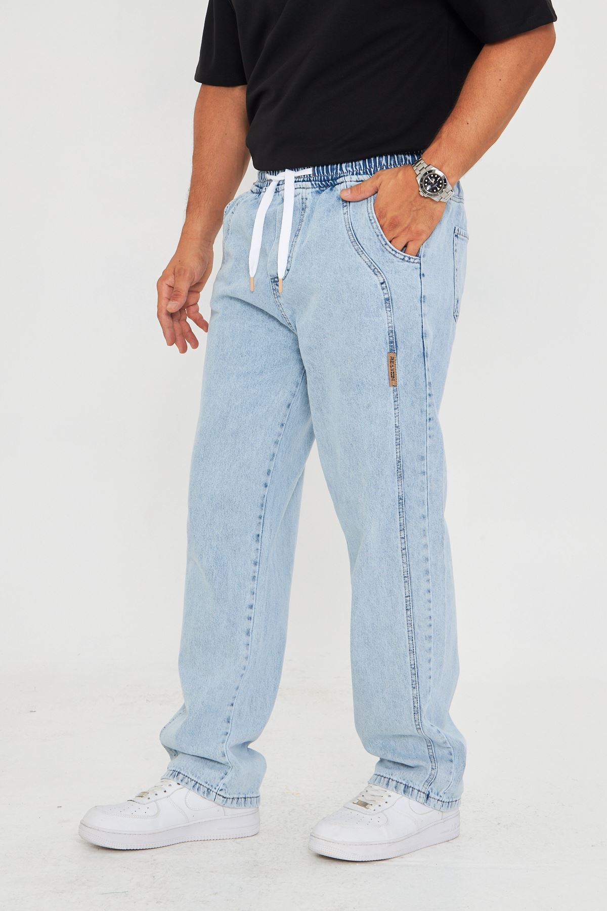 Erkek Baggy Yandan Parçalı Etiket Detaylı Düz Kot Pantolon 707