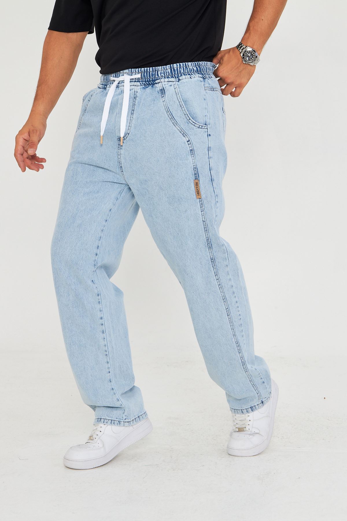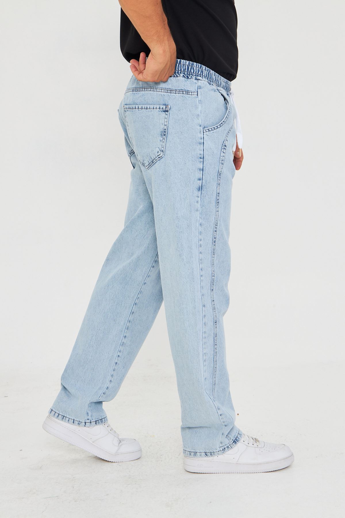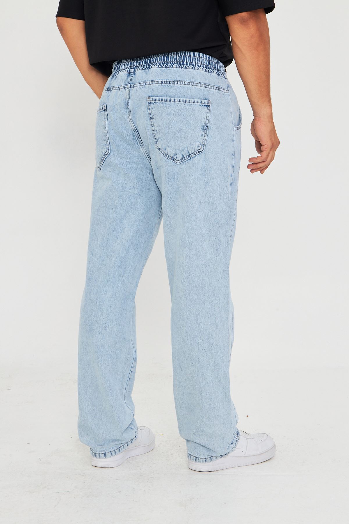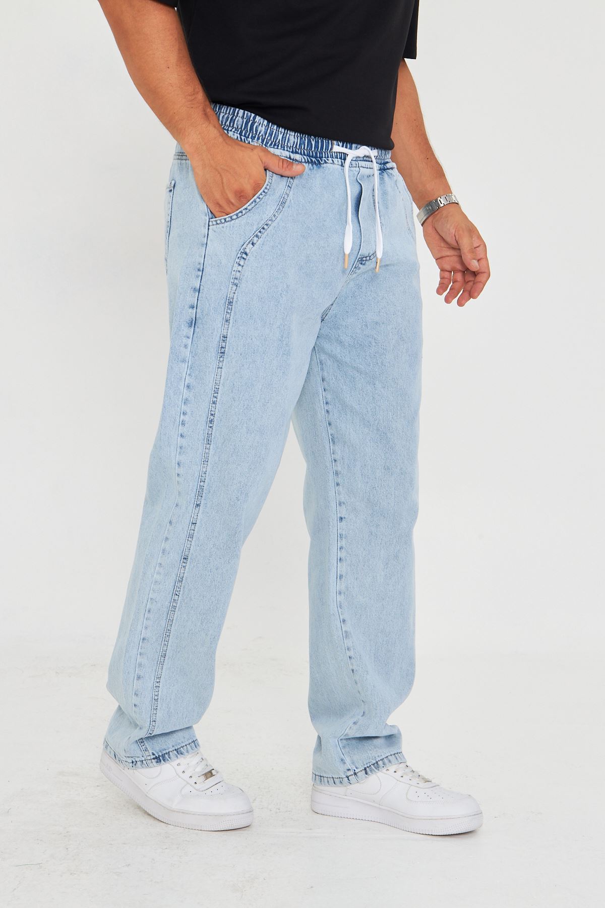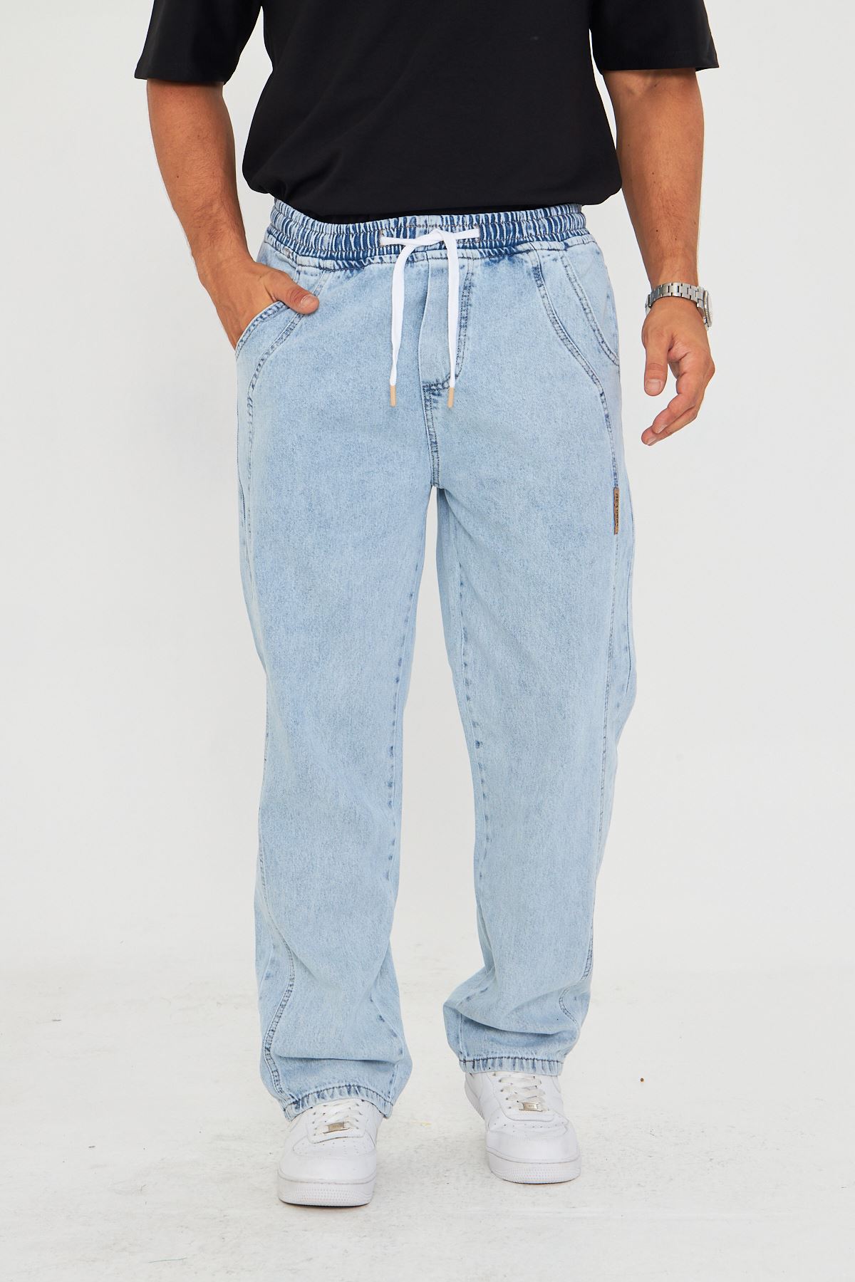 - Esnek yapısı sayesinde gün boyu rahat hareket etme özgürlüğü sunar.; - Bağcıklı kemer tasarımı ile kişisel konforunuzu artırırken şık bir görünüm sağlar.; - Her mevsime uygun, dayanıklı denim kumaşıyla uzun süreli kullanım vaat eder.; - Pratik bağlama/bağcık detayları kolay giyip çıkarmayı mümkün kılar.; - Dokulu yüzeyiyle göz alıcı bir stil oluştururken, orta kalınlığı mevsim geçişlerinde ideal konforu sunar.; - Kutusuz ambalajıyla minimalist ve modern bir tercih yapmanızı sağlar.; - Dört adet fonksiyonel cep bulunması günlük eşyalarınız için pratik saklama alanları sunar.; - Baskısız tasarım, sade ve zamansız bir tarz arayanlar için uygundur.; - Cool & comfort persona ile rahatlık ve şıklığı bir arada yaşamanız için idealdir.; - Denim kumaşın dayanıklılığı sayesinde sık yıkamalara karşı direnç gösterir.; - Astarsız yapısıyla hafiflik hissi verirken pamuk-polyester-elastan karışımından oluşan materyali cildinize nazikçe dokunur.; - Yetişkinler için özel olarak tasarlanmış bu pantolon, her yaş grubuna hitap eder.; - Erkek cinsiyetine yönelik kesimiyle vücut hatlarınıza uyum sağlayarak konforlu bir deneyim sunar.; - Üretim yeri Türkiye'de gerçekleştirilmiş olup yerel malzemelerle üretilmiştir.; - Gündüzden geceye her ortama uyum sağlayan çok yönlülükteki tasarım gardrobunuzda vazgeçilmez olacak.; - Baggy kesimi modern ve rahat bir siluet çizerken düz paça detayıyla sadelikten ödün vermez.