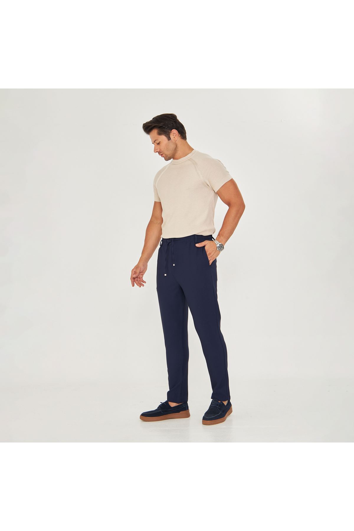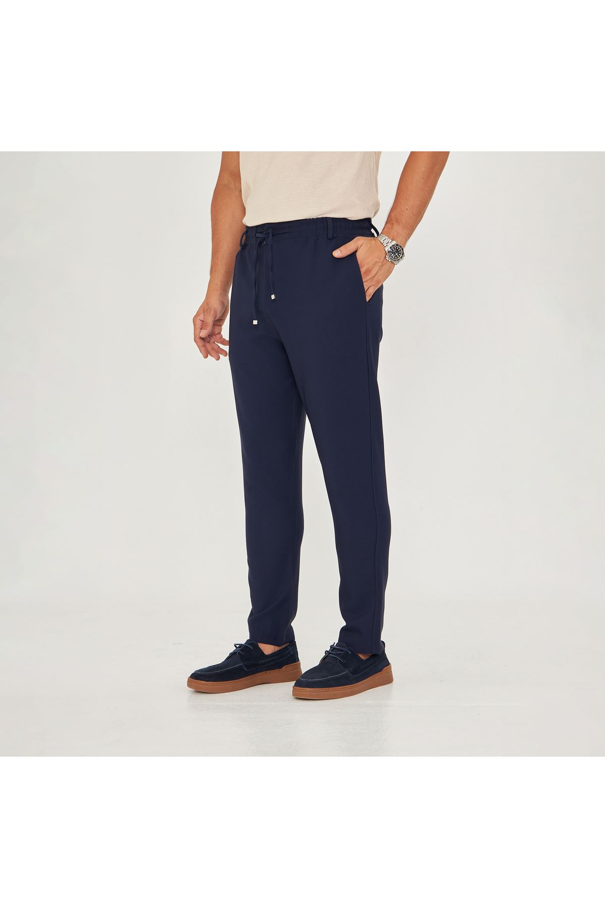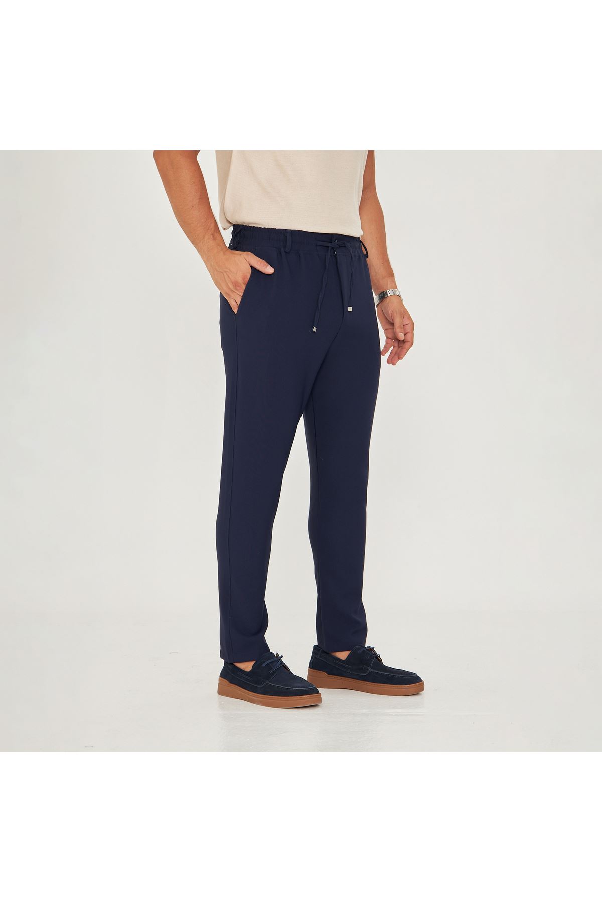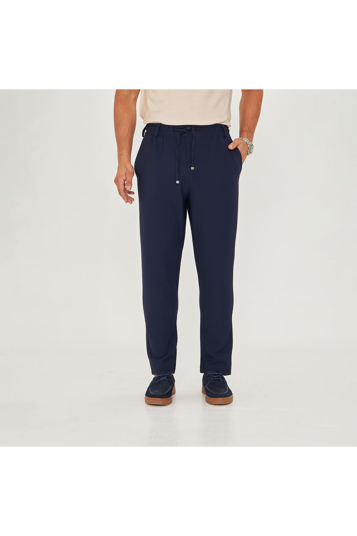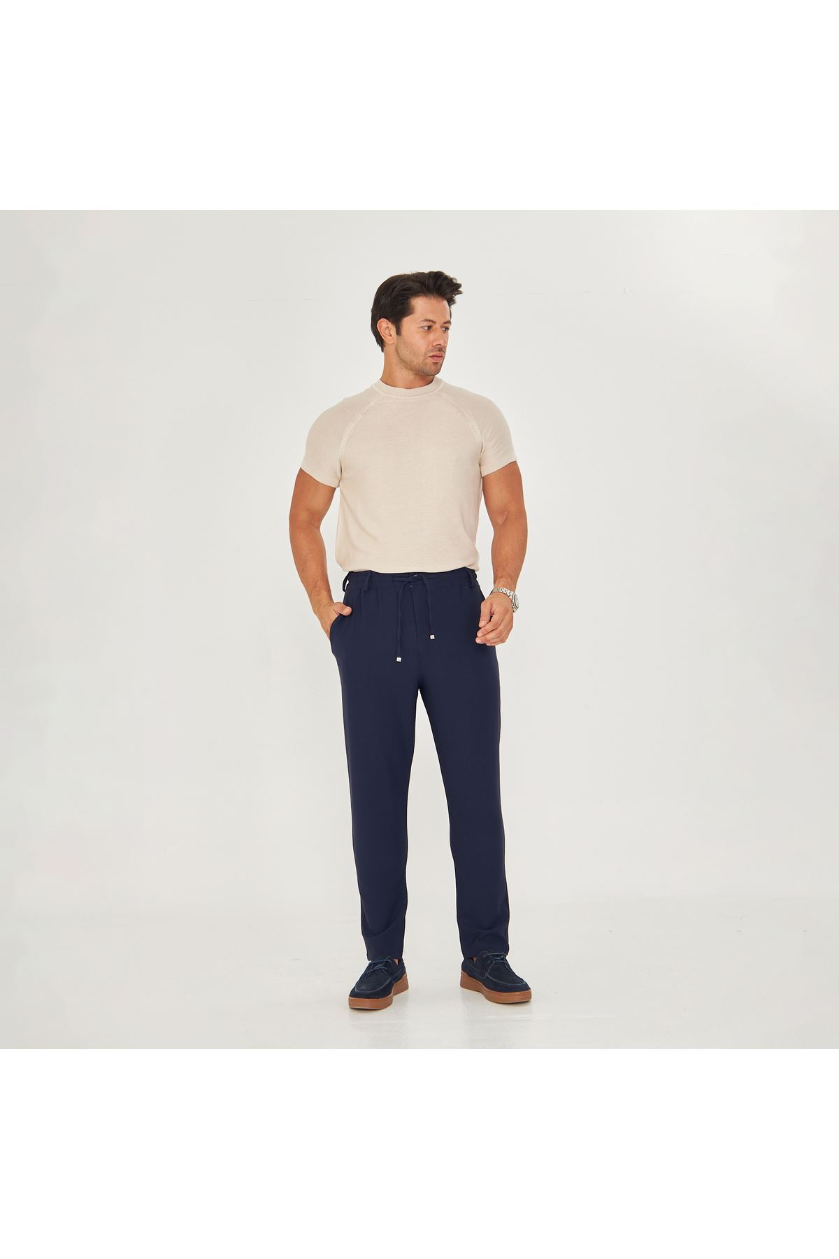 - Klasik tasarımıyla her ortamda şıklığınızı koruyun; düğümlü bel kemerleri ve bağcıklı yapısı ile kolayca ayarlama imkanı sunar.; - Her mevsim rahatlıkla tercih edebileceğiniz bu pantolon, orta kalınlığı sayesinde dört mevsim konfor sağlar.; - Sade ve düz deseniyle zamansız bir tarz yaratırken, 4 cep detayı pratik kullanım sunar.; - Baskısız ve astarsız yapısıyla minimalist bir görünüm elde etmenize olanak tanır.; - Orta silueti ve yarım pat fermuar kapama şekliyle modern bir dokunuş katarken esnekliği sayesinde gün boyu rahat hareket etme özgürlüğü verir.; - Günlük kullanım için ideal olan bu pantolon, slim fit kesimiyle vücut hatlarınıza mükemmel uyum sağlar.; - Esnek yapısı sayesinde farklı bedenlere kolayca uyum göstererek konforlu bir deneyim yaşatır.; - Genç ve yetişkin erkeklerin beğenisine sunulan bu ürün, günlük giyimin vazgeçilmez parçasıdır.; - Türkiye'de üretilmiş olup yerel malzemelerle kalite standartlarına uygun şekilde hazırlanmıştır.; - Dokuma kumaşı dayanıklılığı artırarak uzun süreli kullanım vaad ederken regular boy kesimiyle her vücut tipine hitap eder.; - Normal bel yüksekliği ile hem rahatlık hem de şık duruş sunarken düz paça tasarımı modern çizgilere sahiptir.