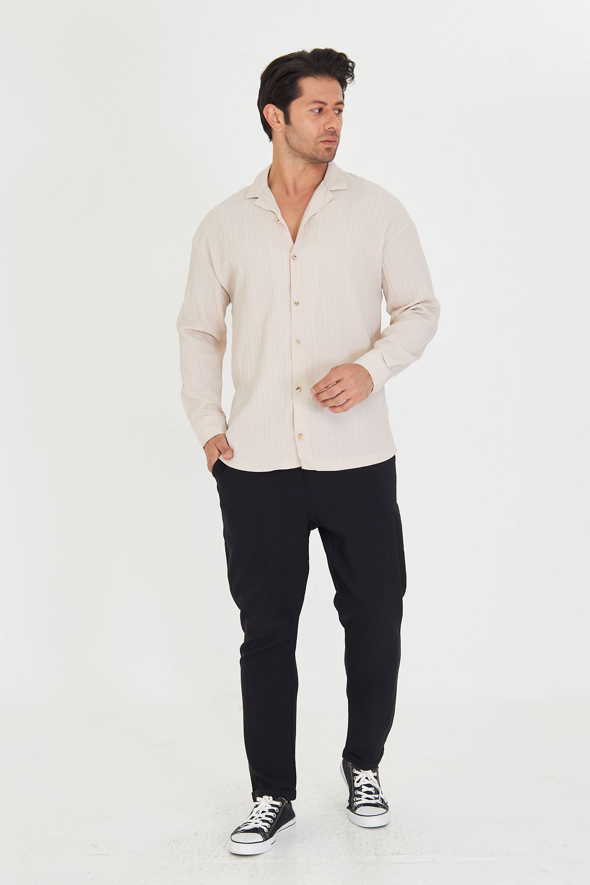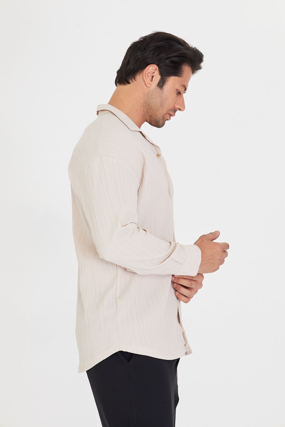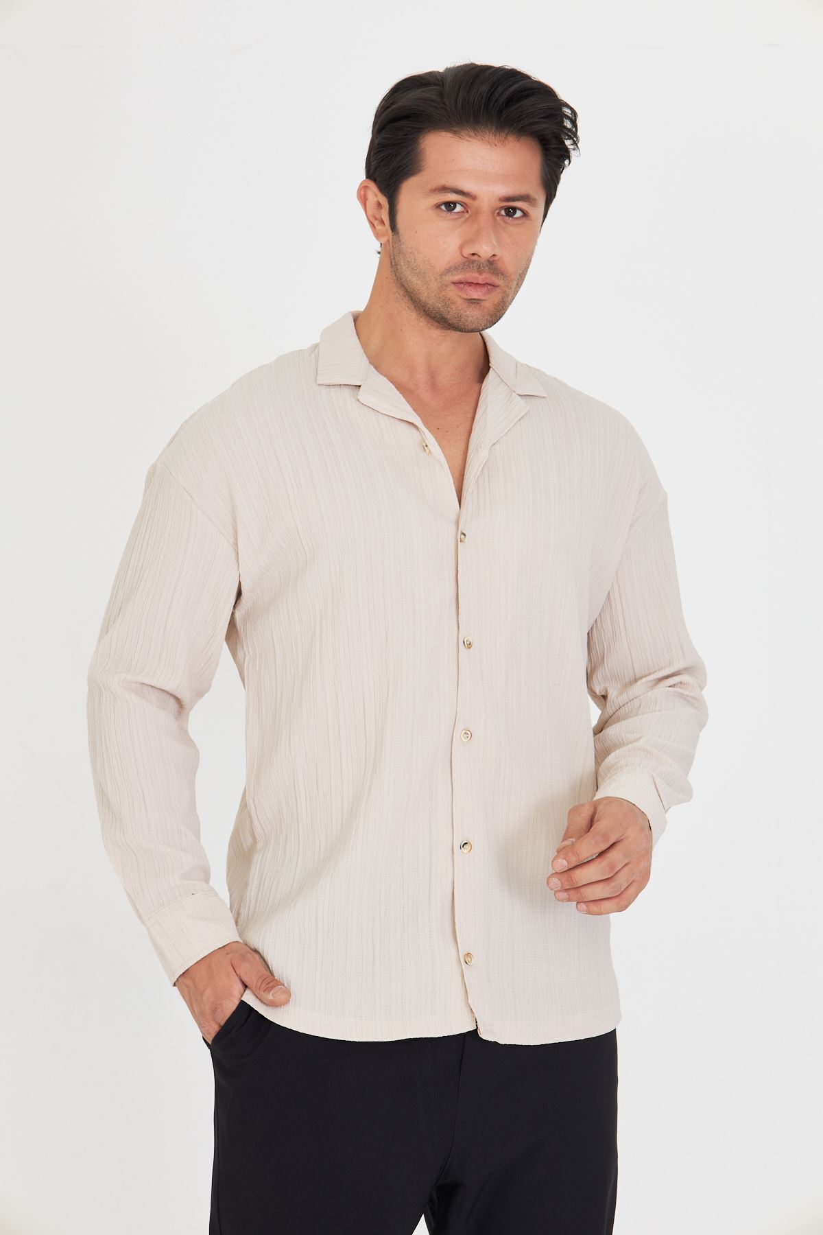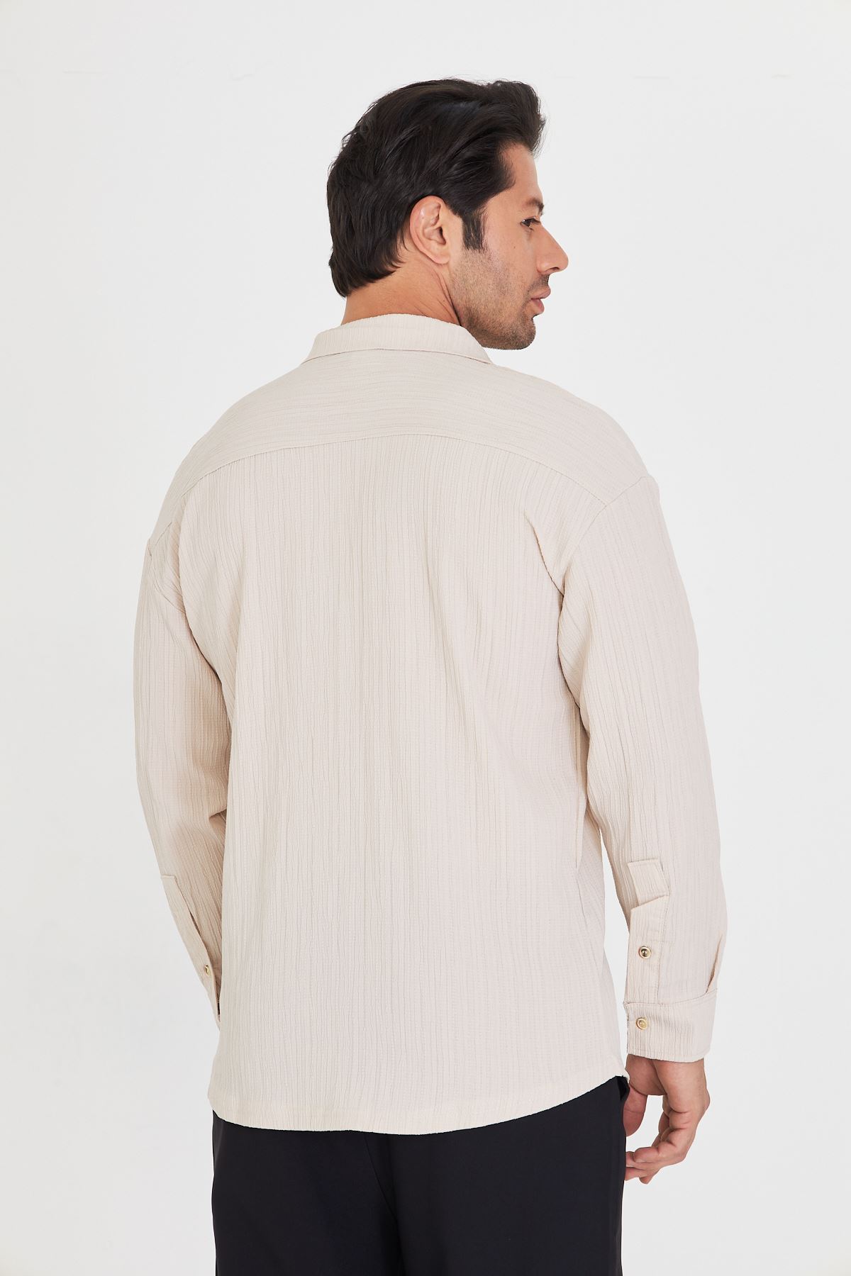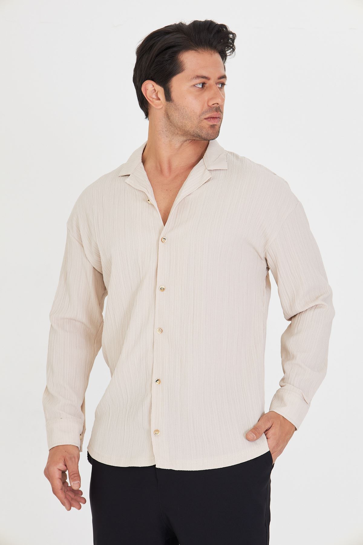 Erkek Düşük Omuz Bürümcük Desen Oversize Apaç Uzun Kol Yaka Gömlek