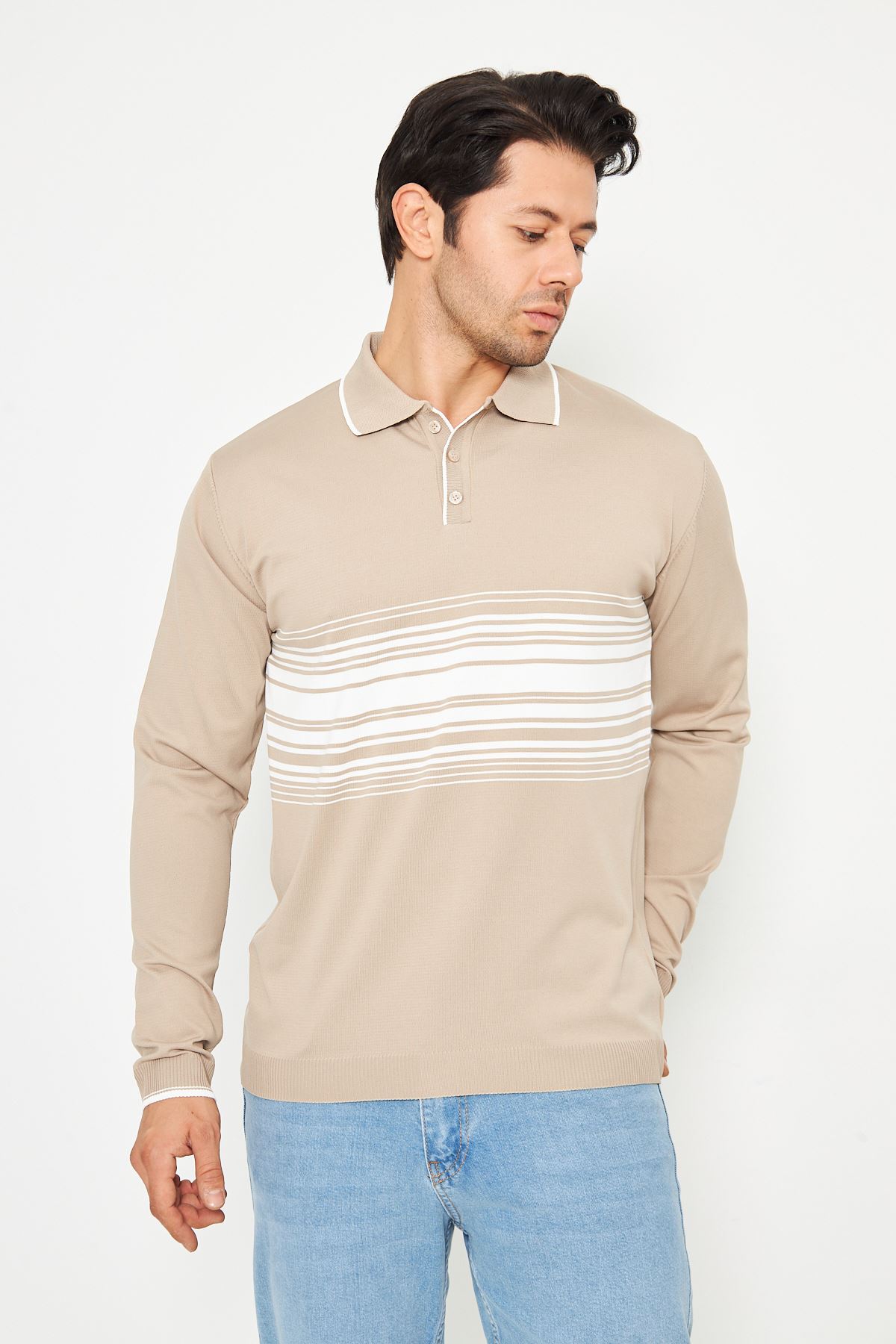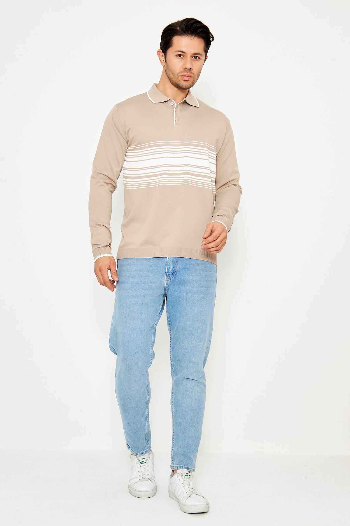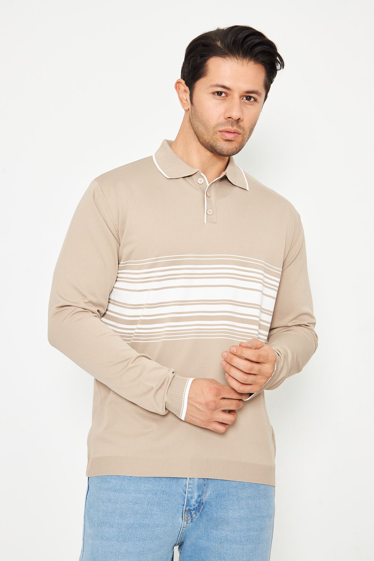 Erkek Göğüs Çizgili Örme Kazak Şık Ve Rahat Günlük Kullanıma Uygun Düğmeli Polo Yaka Kısa Kol Kazak