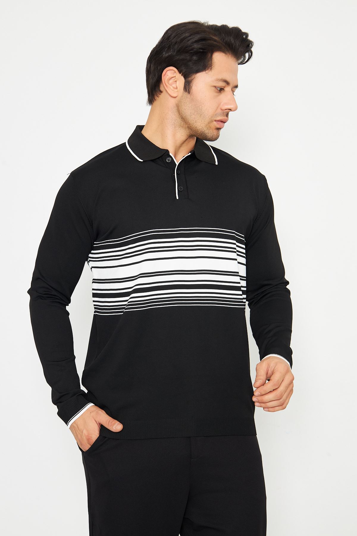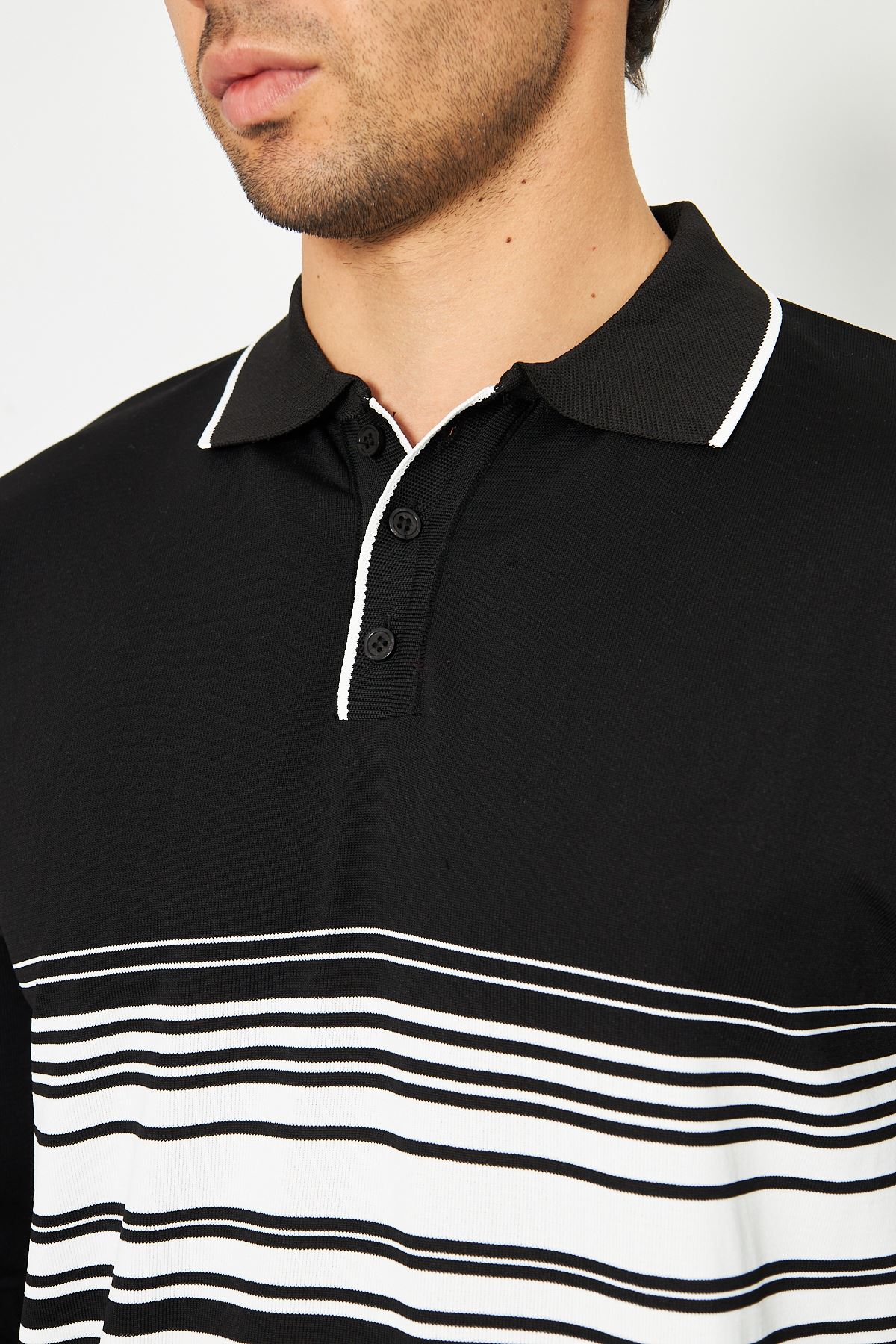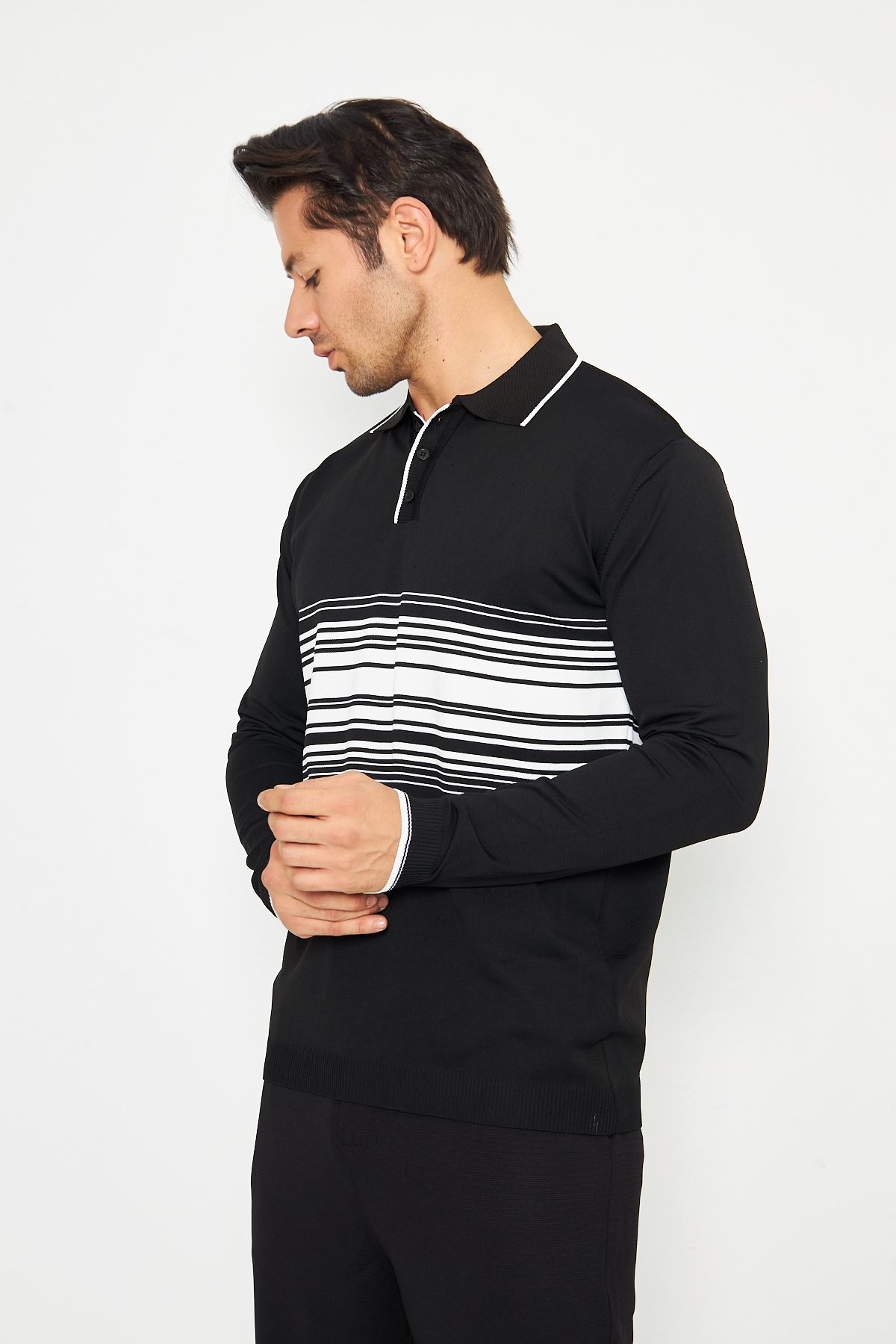 Erkek Göğüs Çizgili Örme Kazak Şık Ve Rahat Günlük Kullanıma Uygun Düğmeli Polo Yaka Kısa Kol Kazak