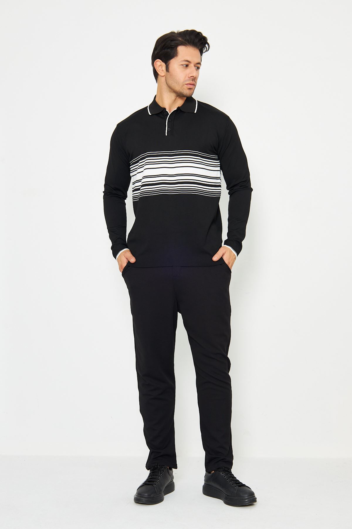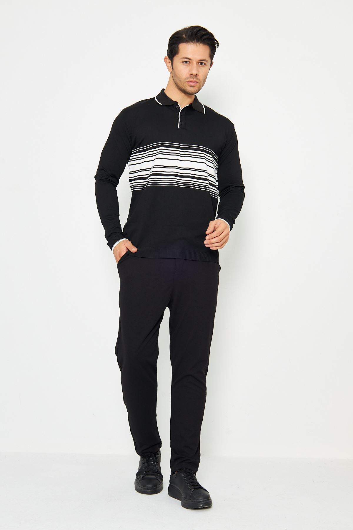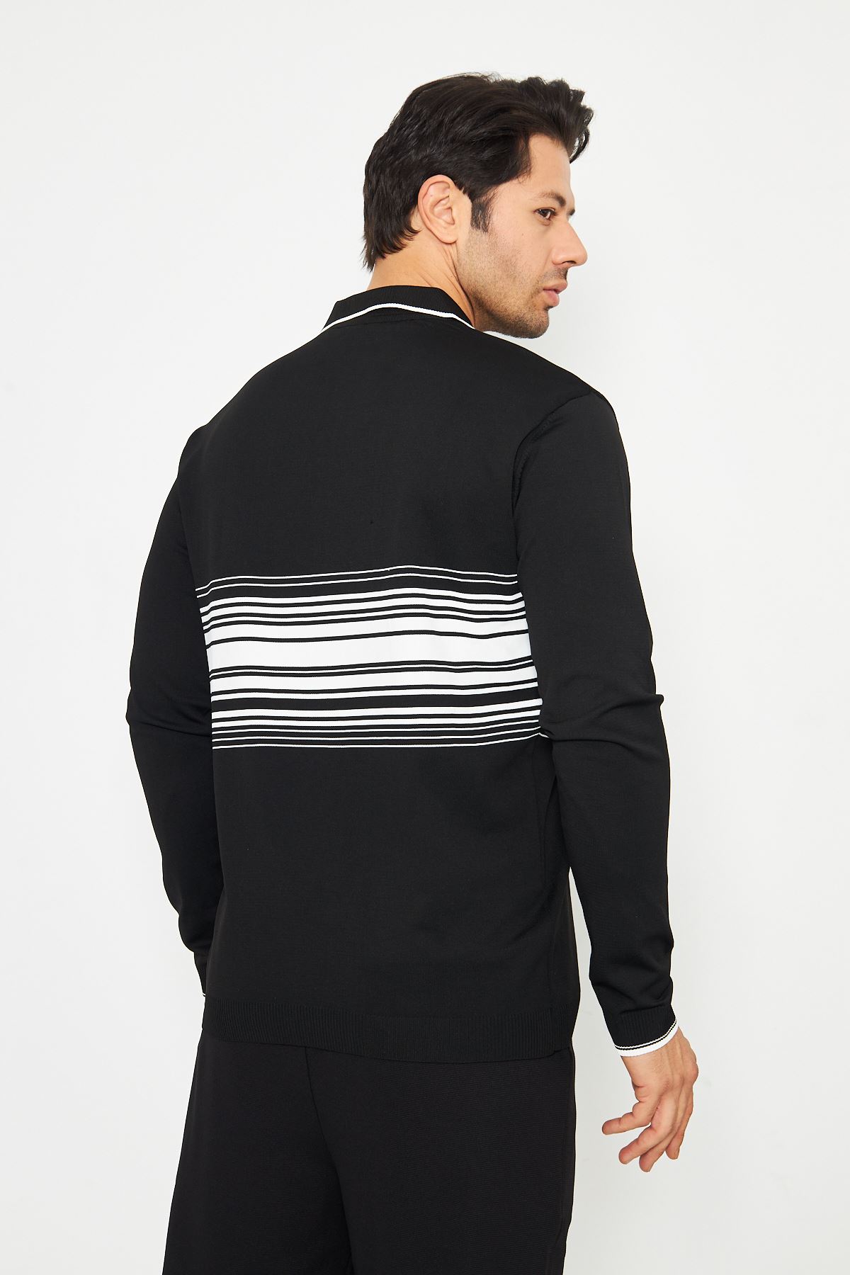 Erkek Göğüs Çizgili Örme Kazak Şık Ve Rahat Günlük Kullanıma Uygun Düğmeli Polo Yaka Kısa Kol Kazak