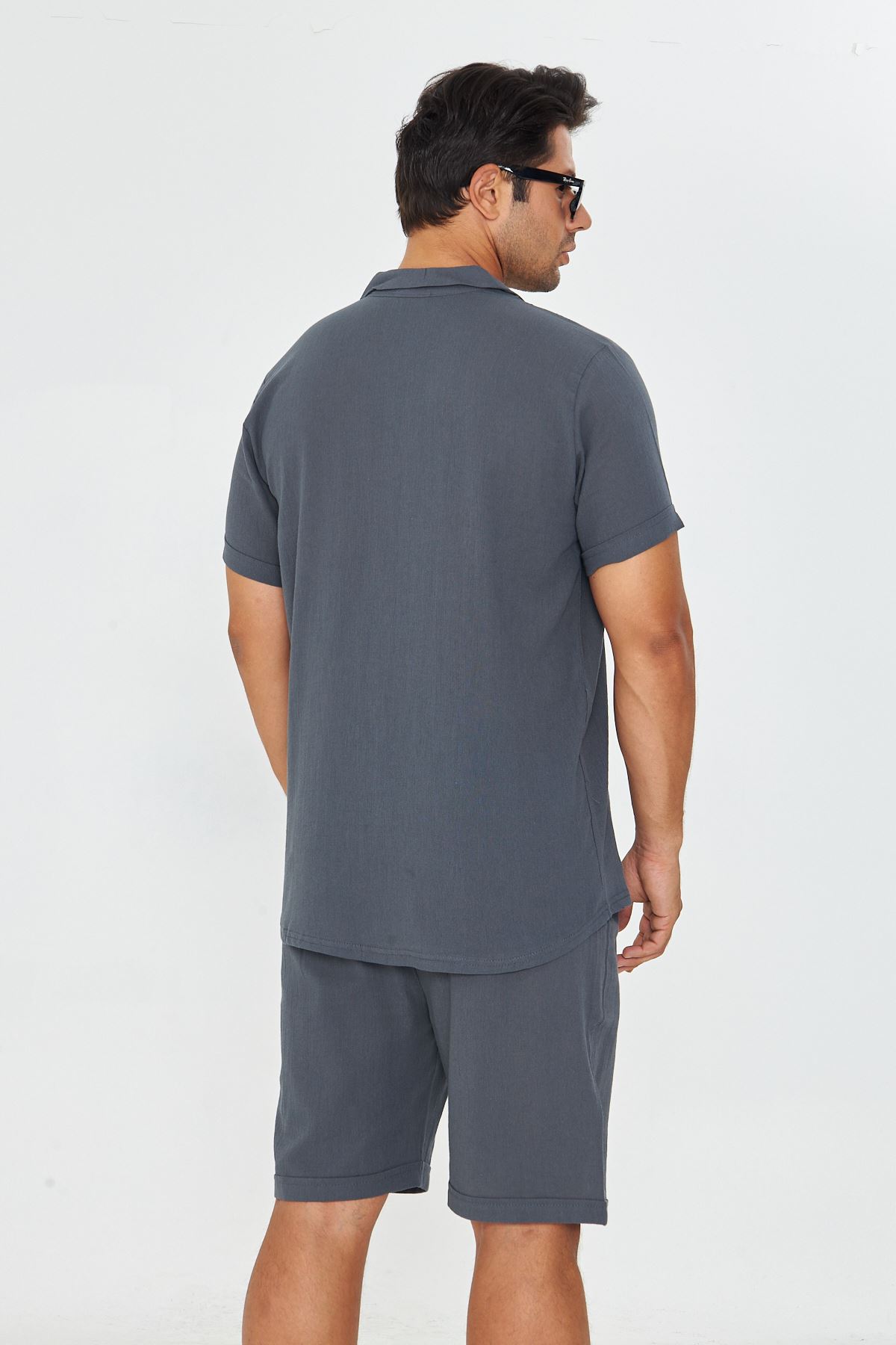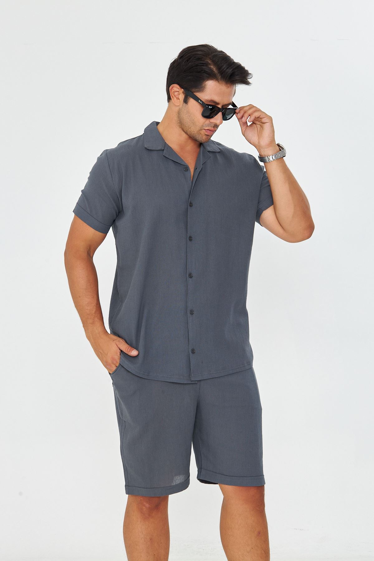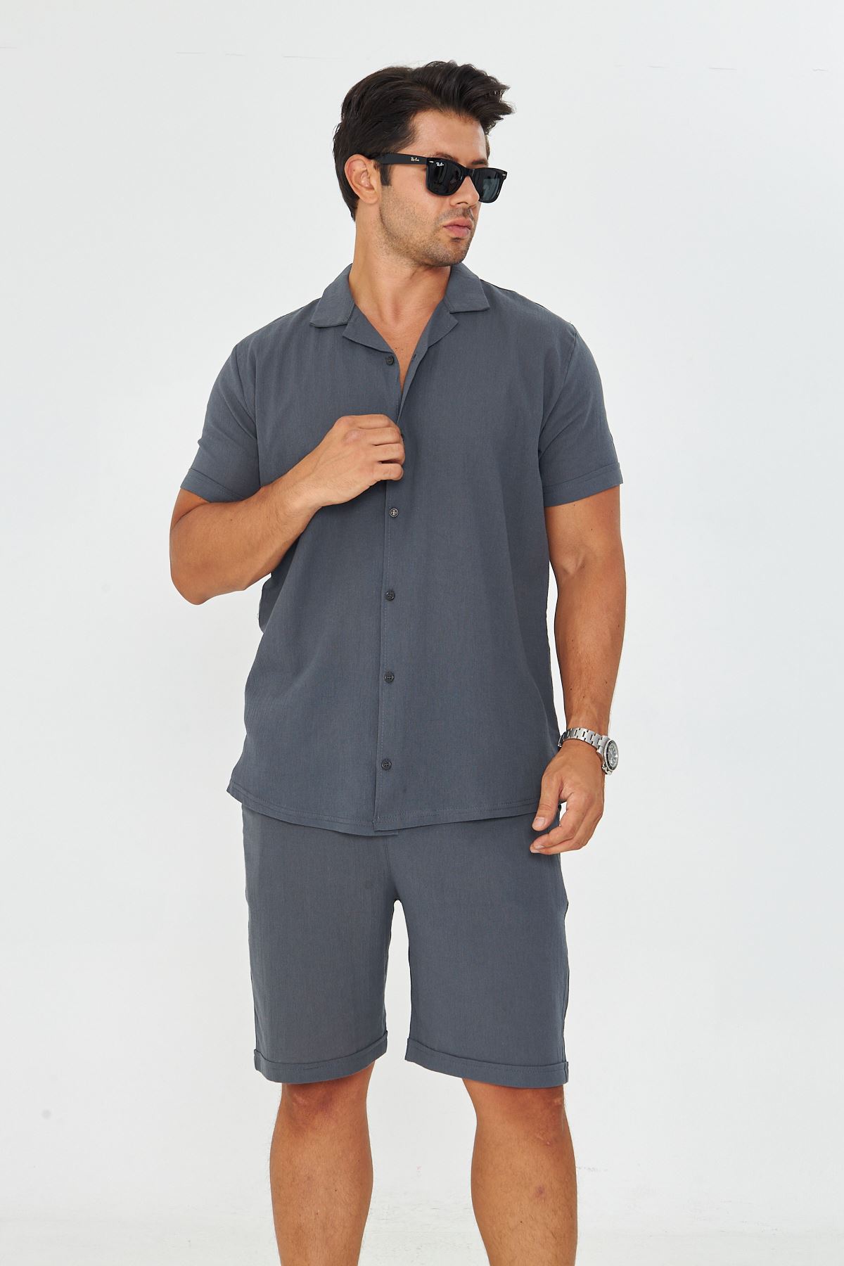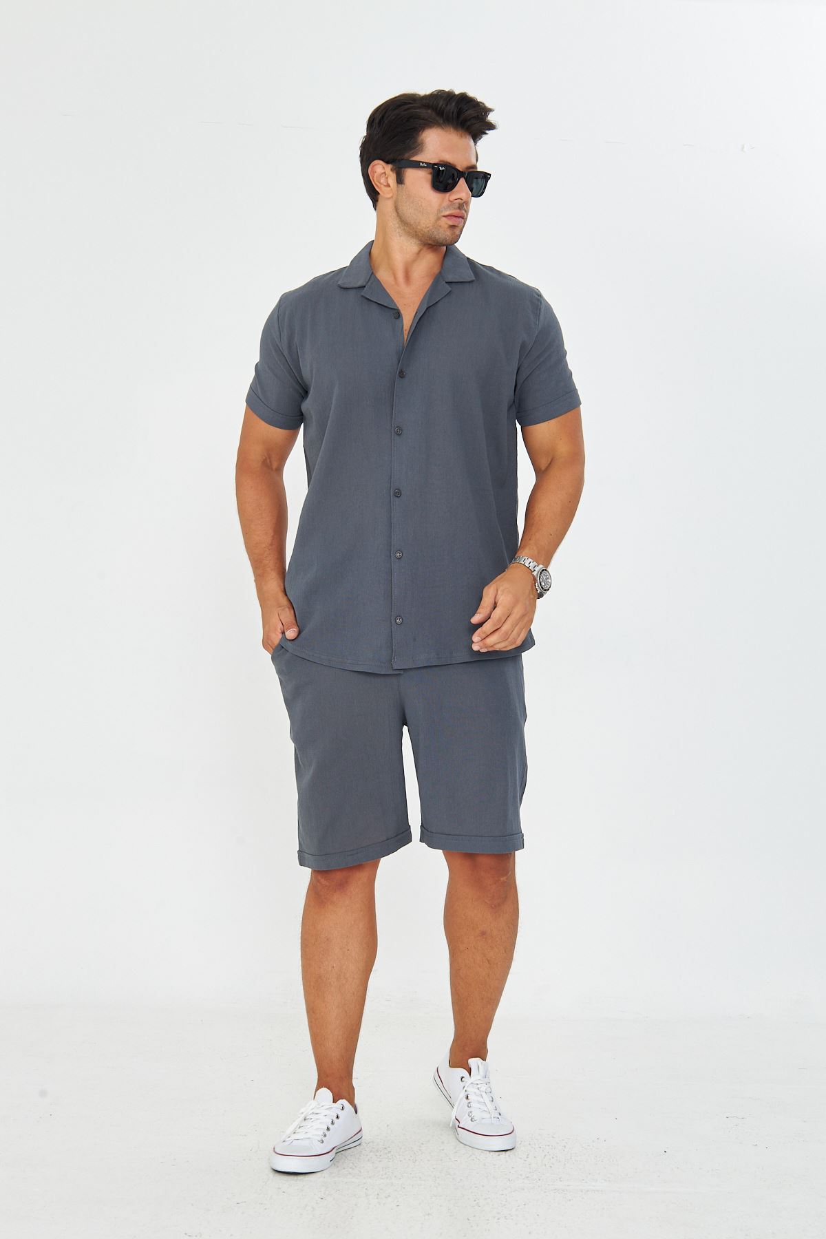 Erkek Keten Apaş Yaka Kısa Kol Gömlek - Şort Takım
