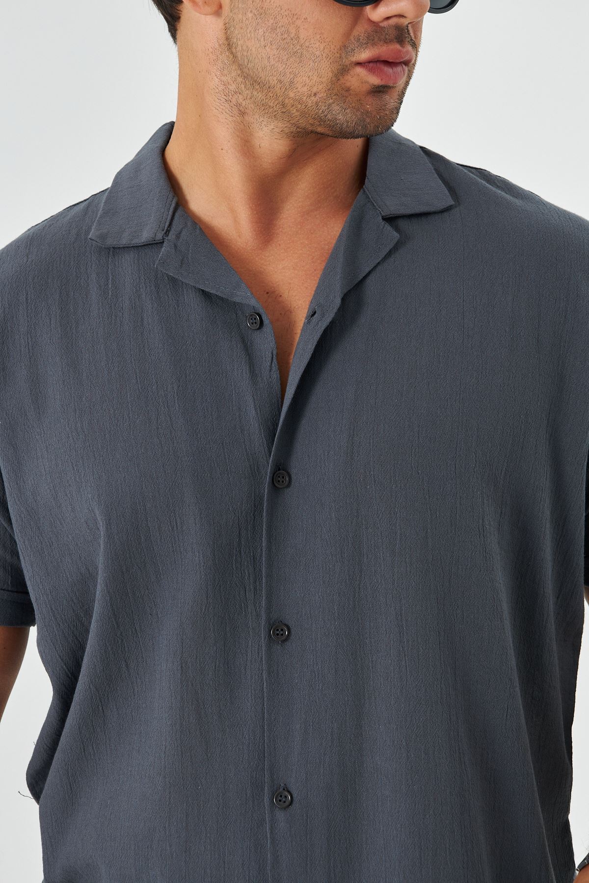 Erkek Örme Kumaş Düğmeli Apaçi yaka Şık Crep Desen Günlük Kullanıma Uygun Kısa Kol Gömlek