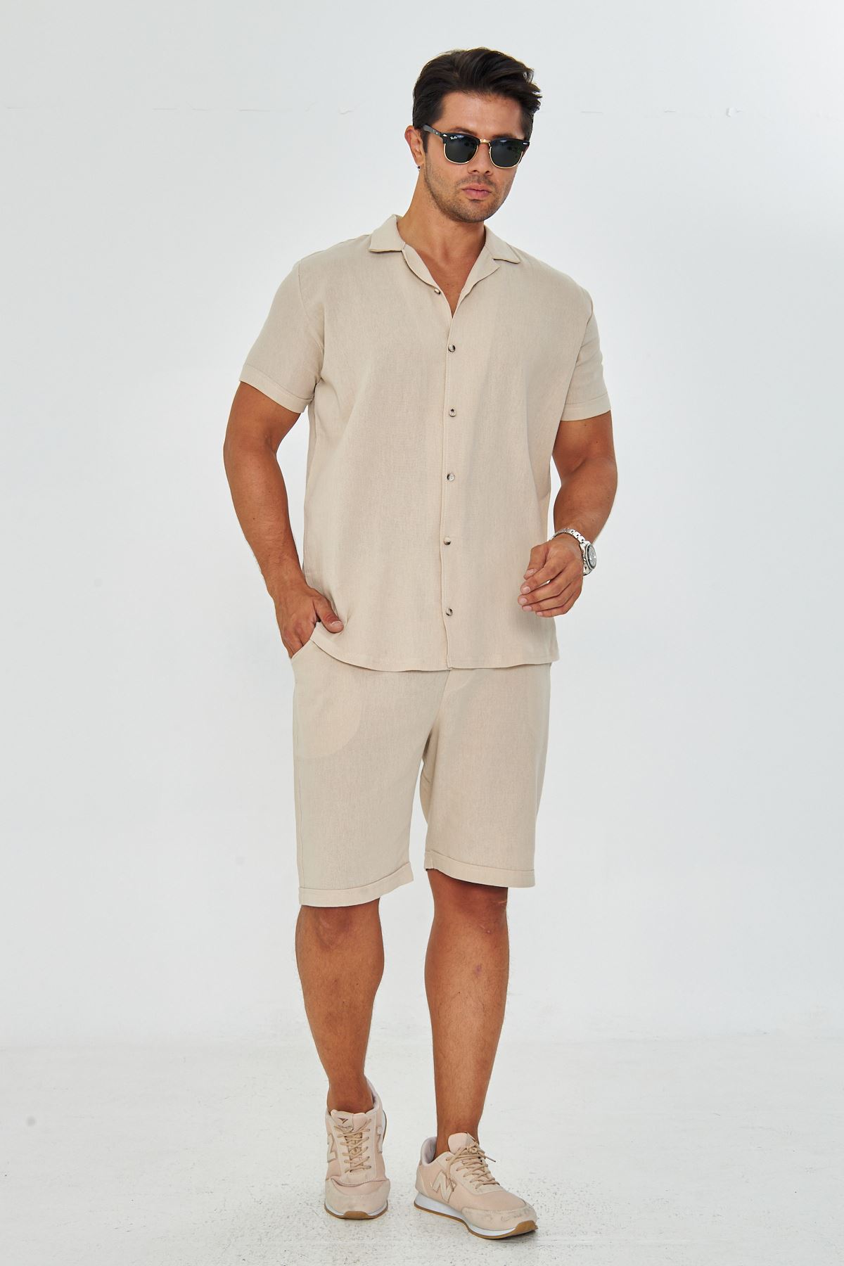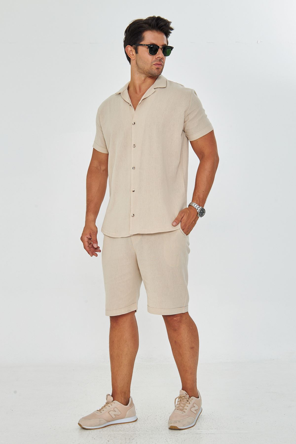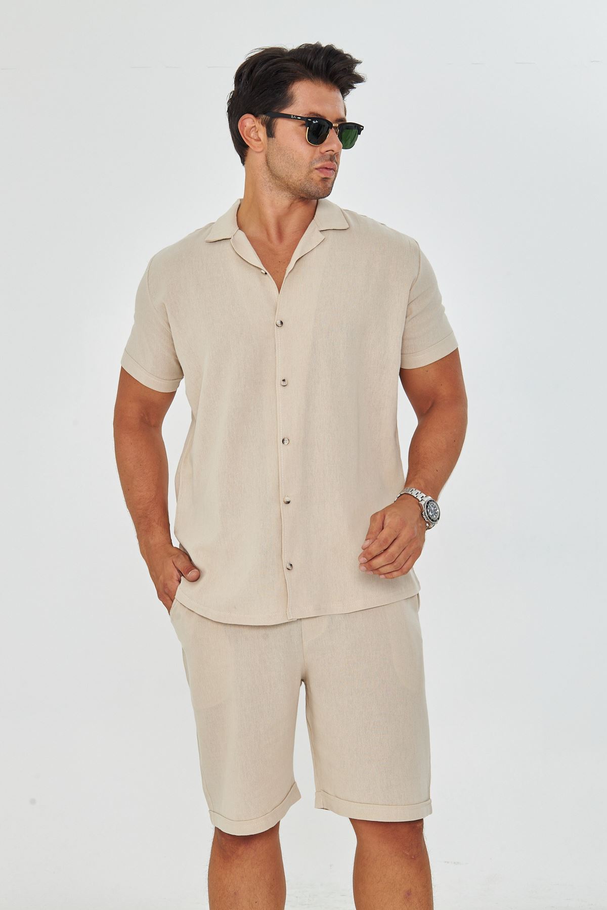 Erkek Keten Apaş Yaka Kısa Kol Gömlek - Şort Takım