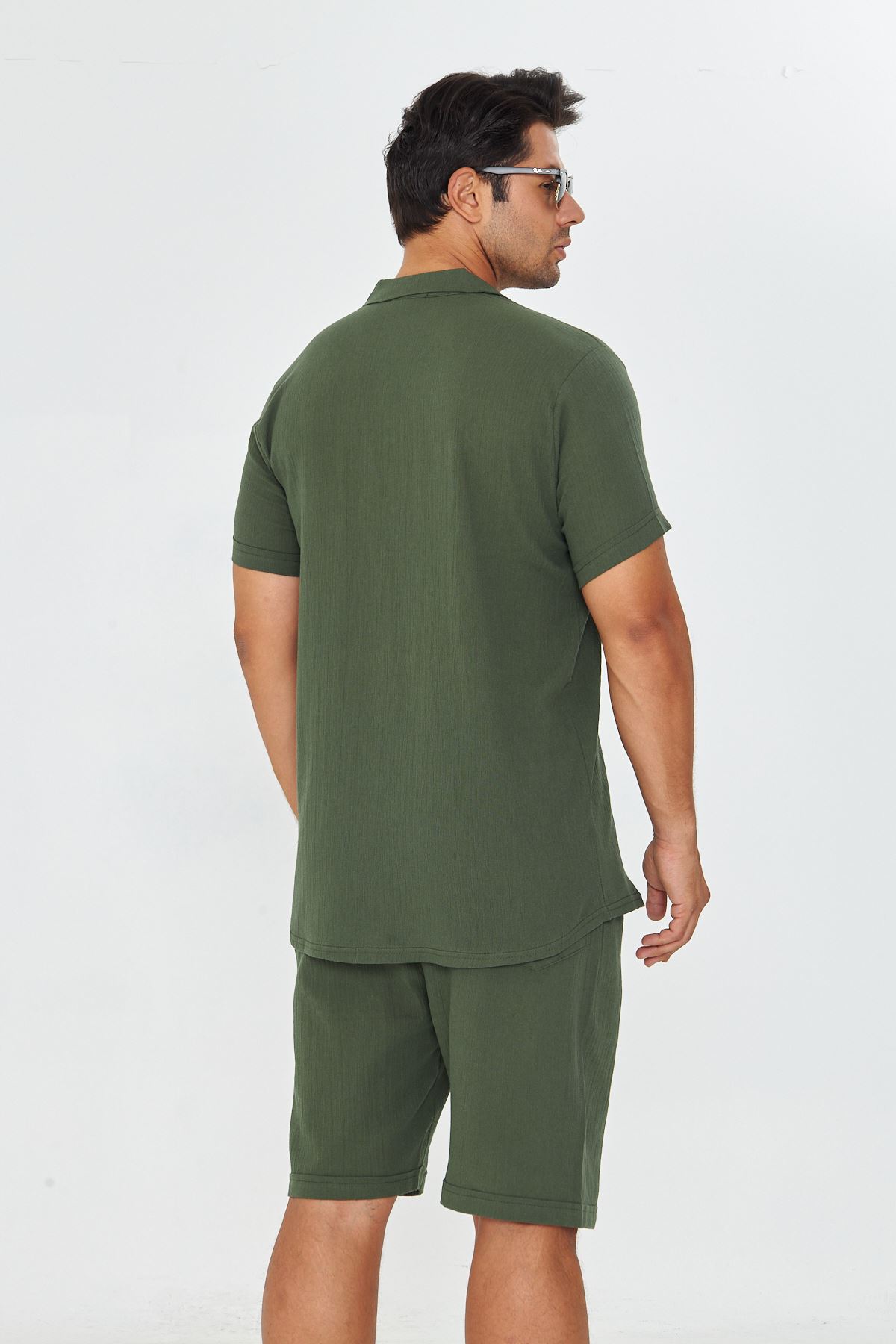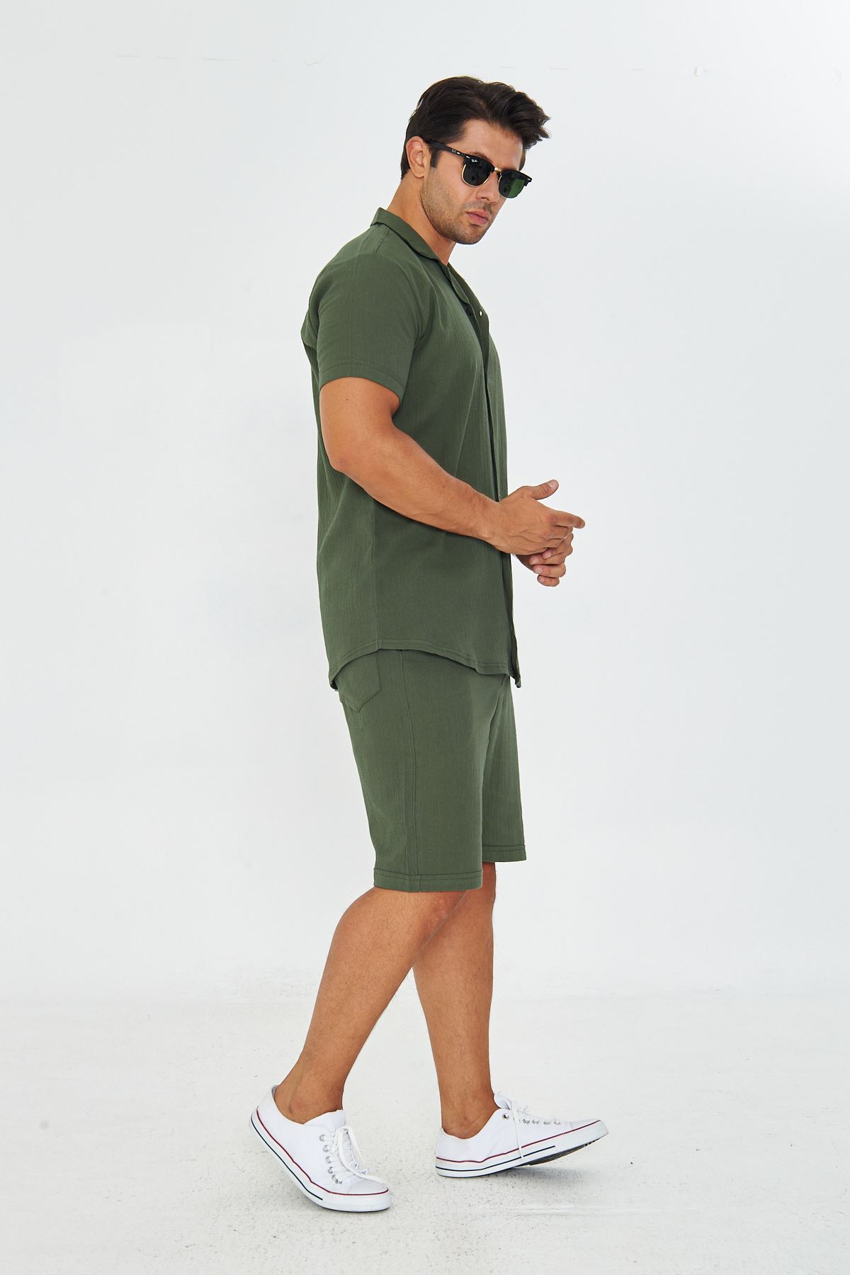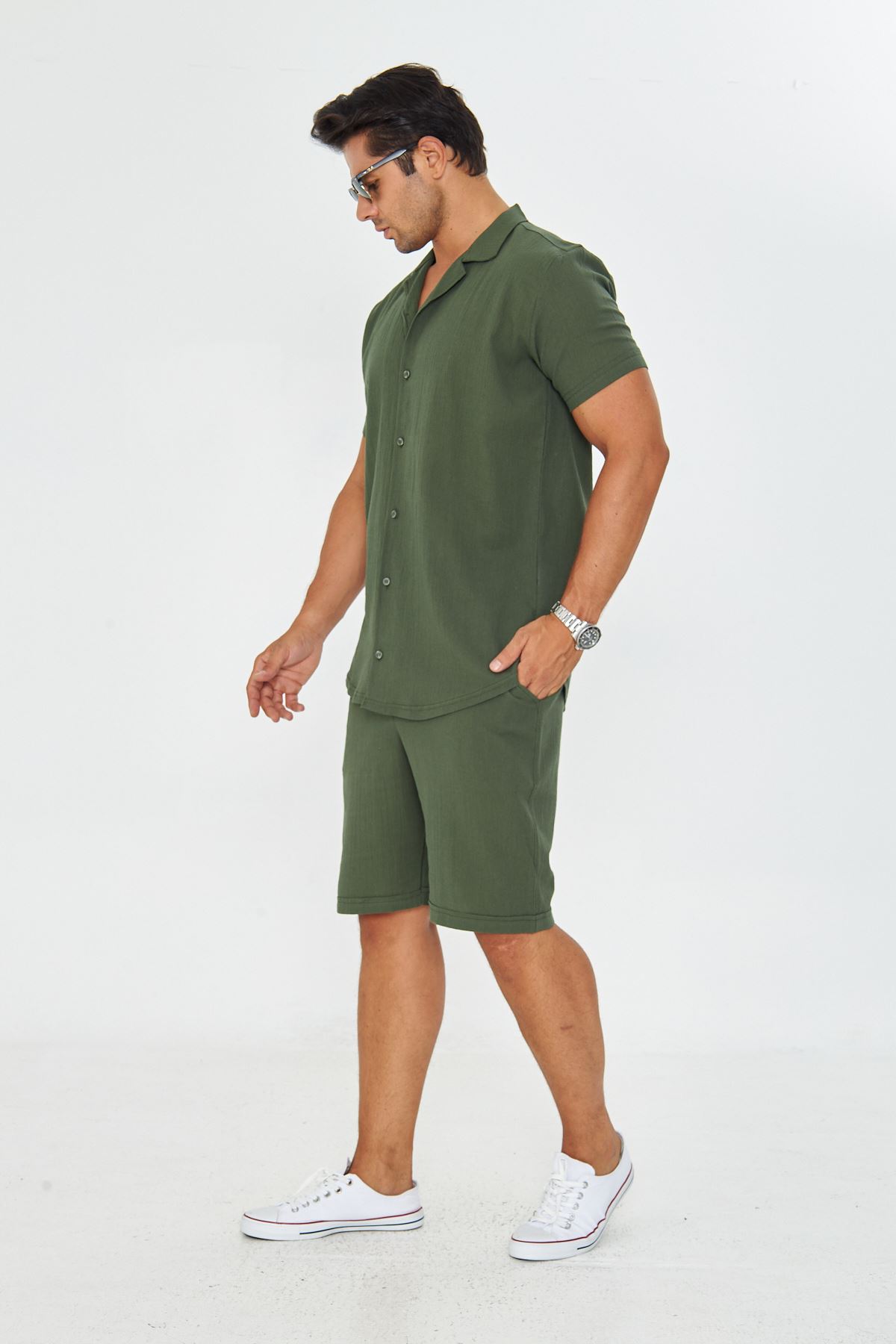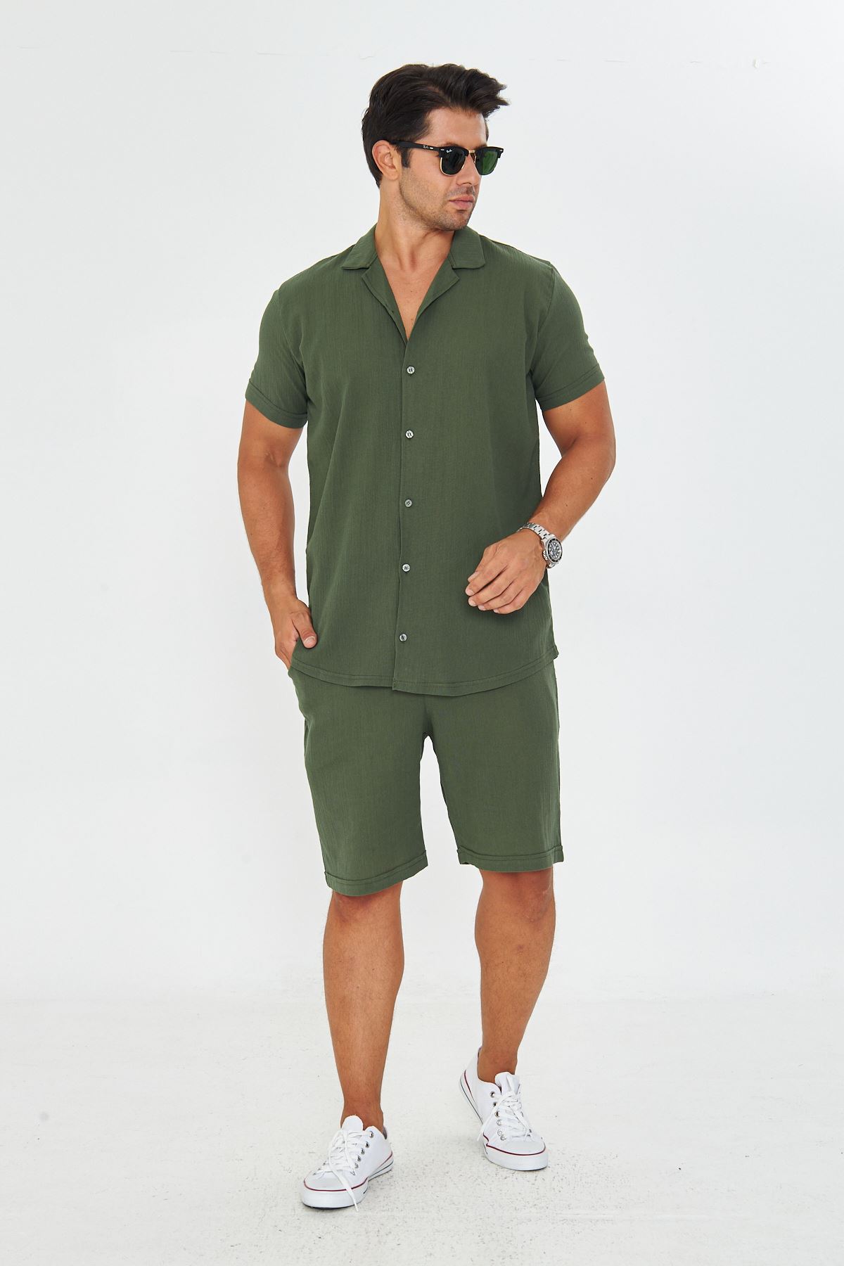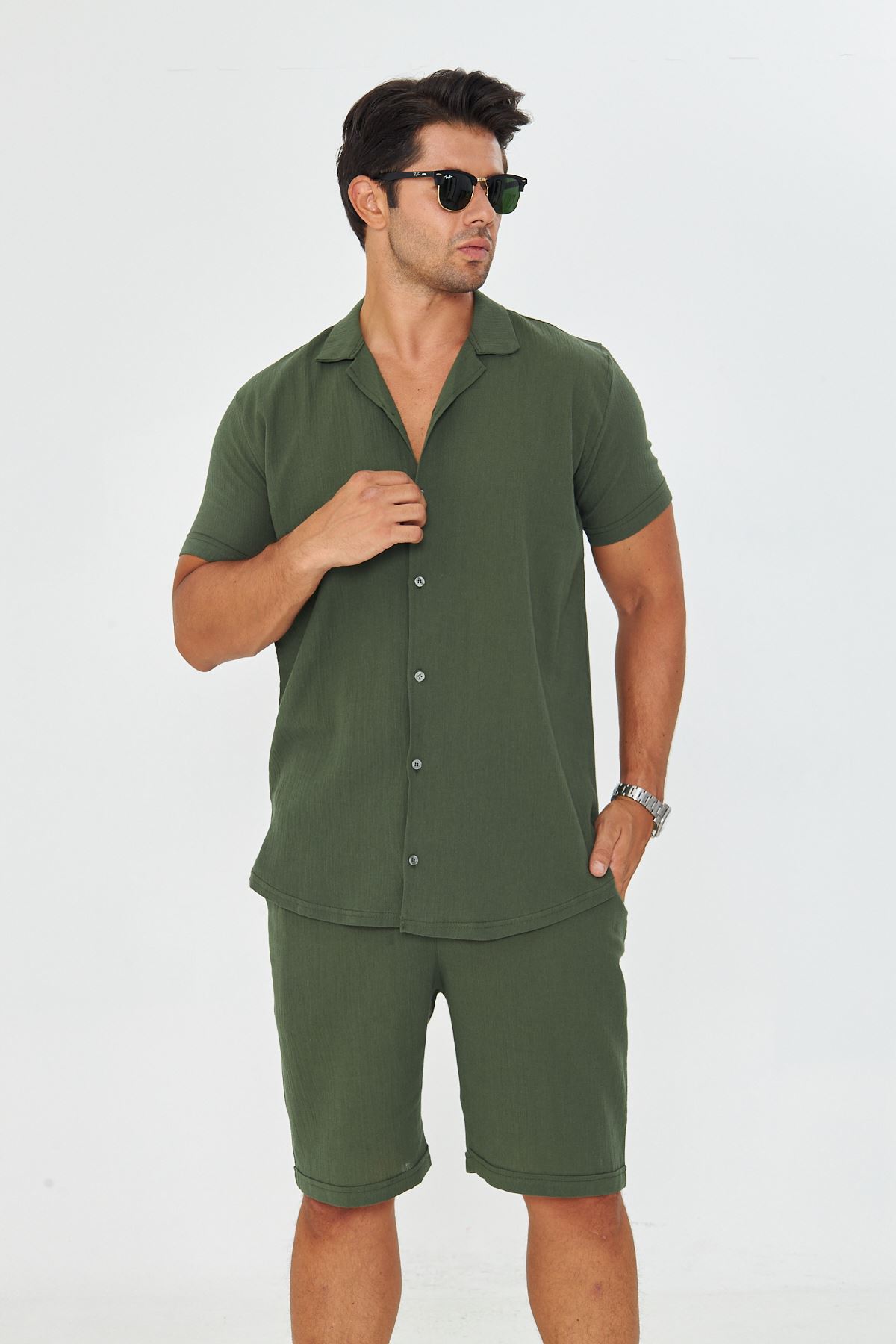Erkek Keten Apaş Yaka Kısa Kol Gömlek - Şort Takım