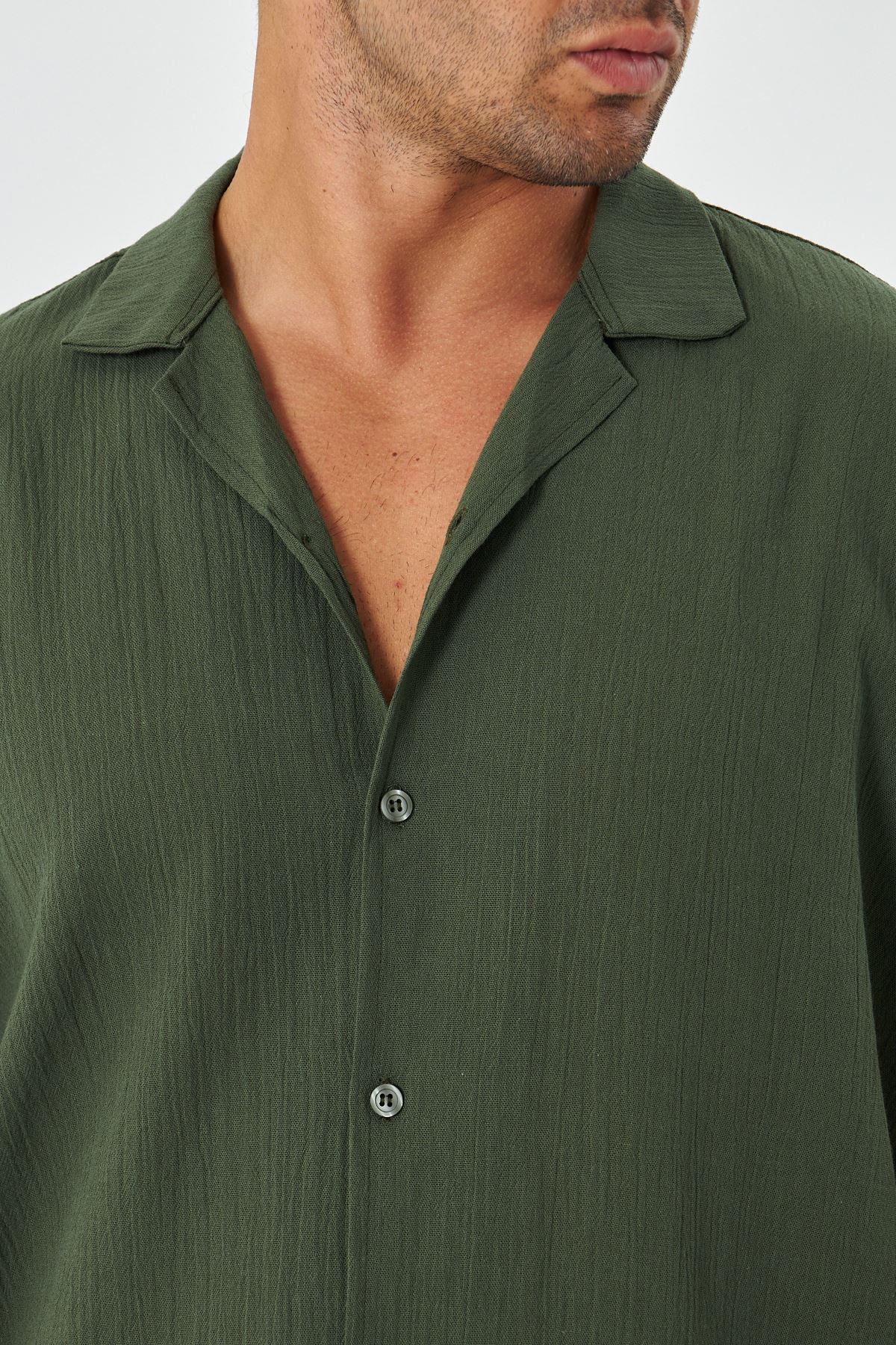Erkek Örme Kumaş Düğmeli Apaçi yaka Şık Crep Desen Günlük Kullanıma Uygun Kısa Kol Gömlek