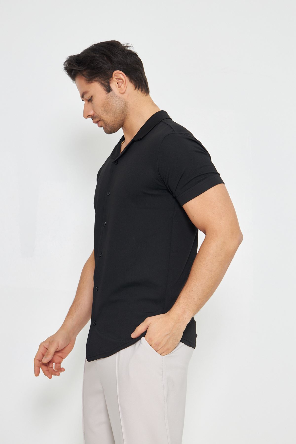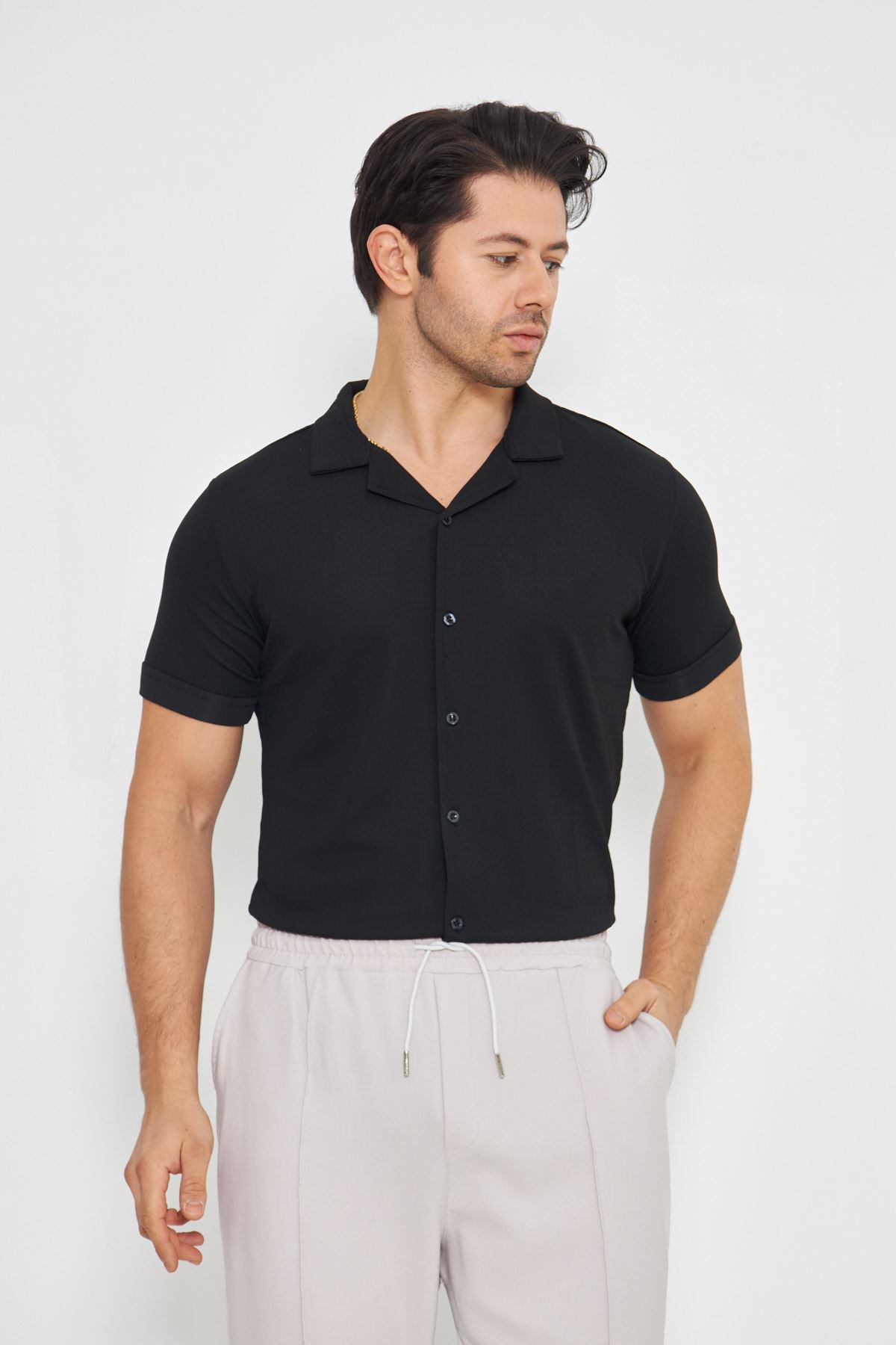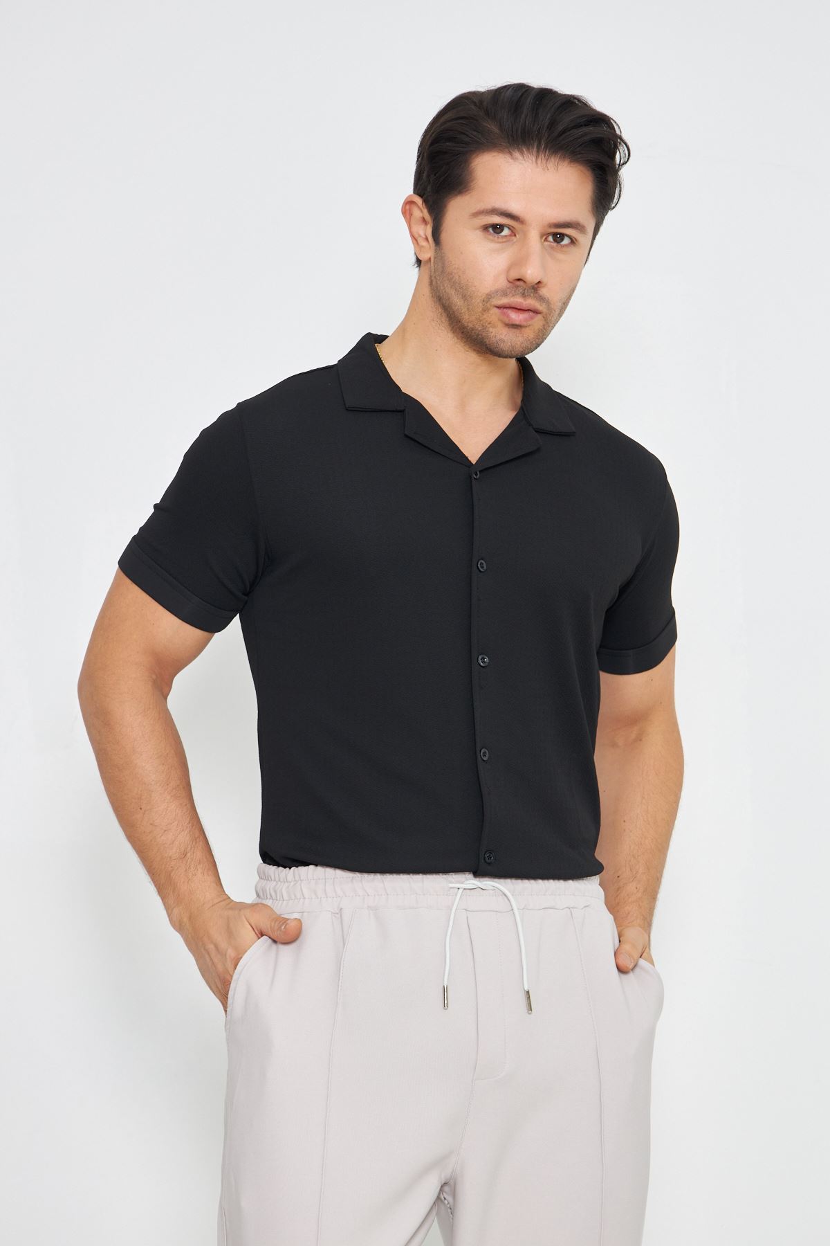 Erkek Örme Kumaş Düğmeli Apaçi yaka Şık Crep Desen Günlük Kullanıma Uygun Kısa Kol Gömlek