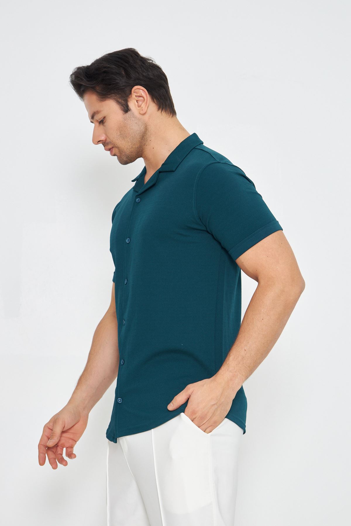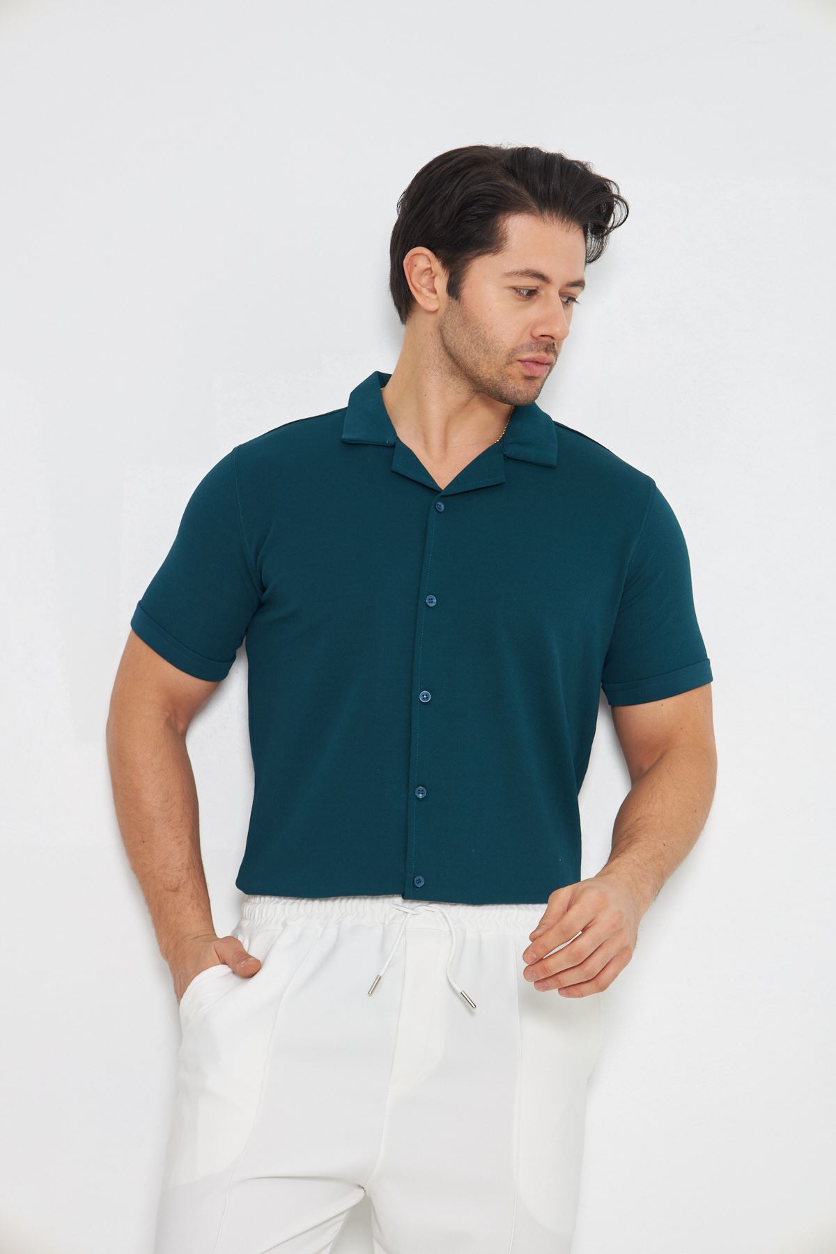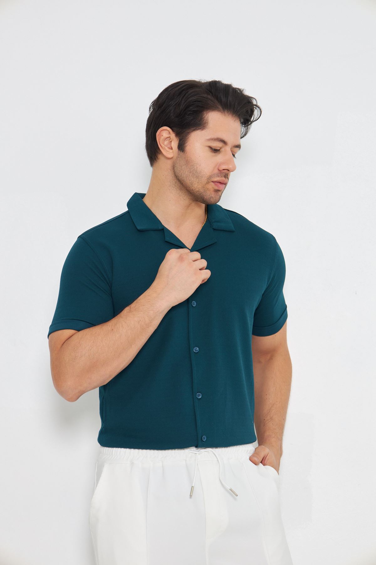 Erkek Örme Kumaş Düğmeli Apaçi yaka Şık Crep Desen Günlük Kullanıma Uygun Kısa Kol Gömlek