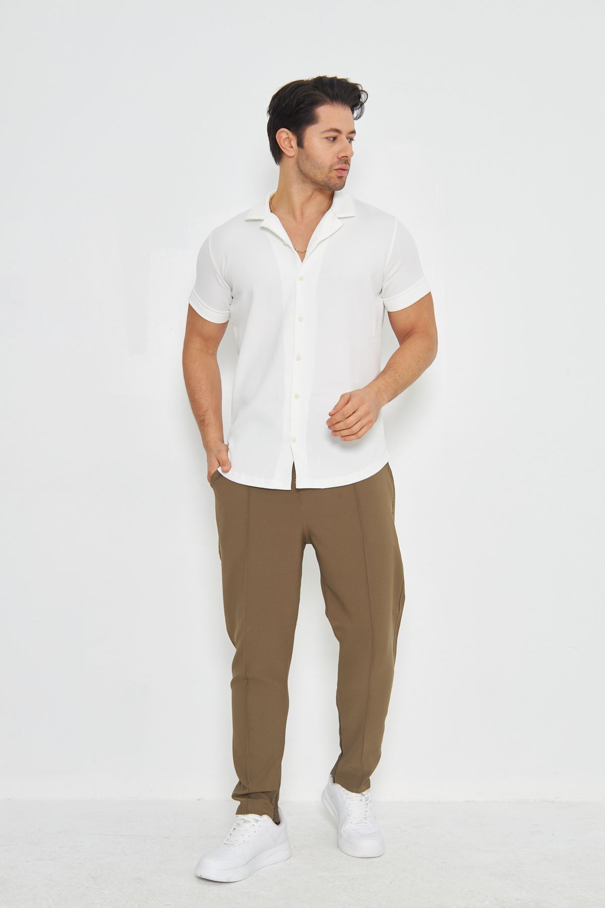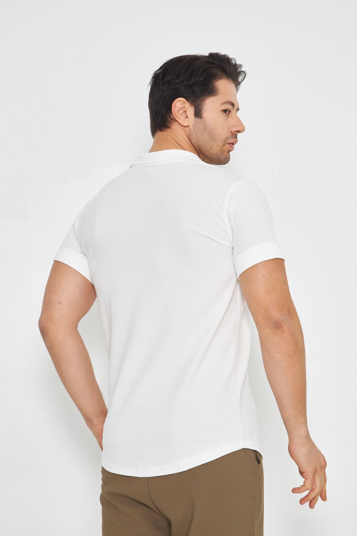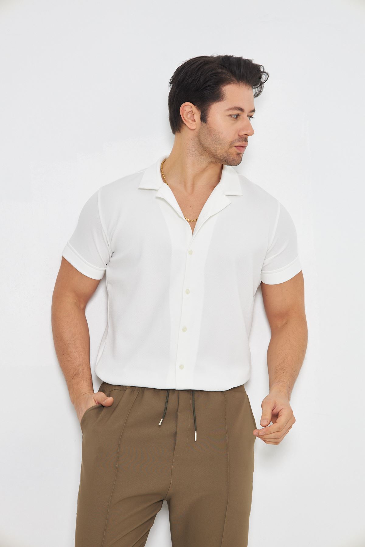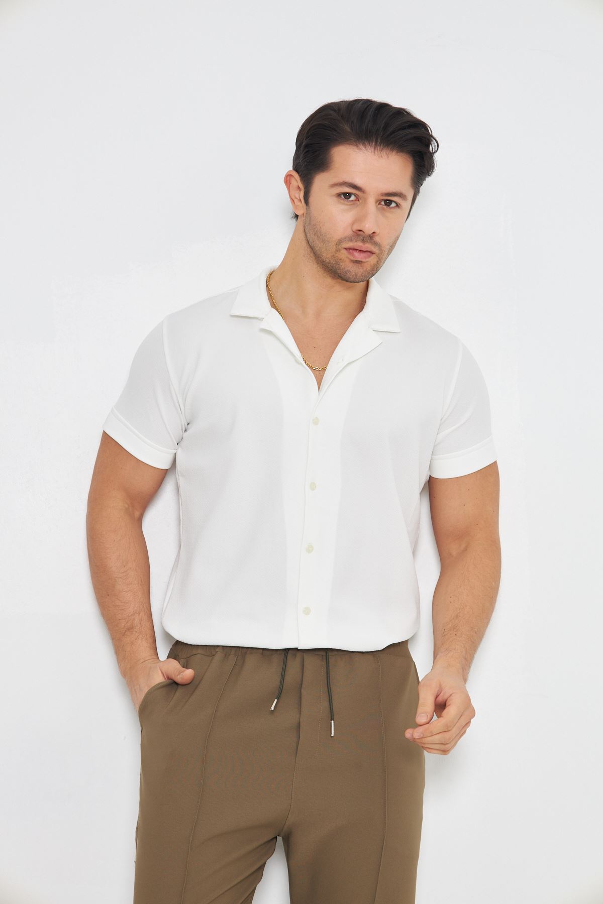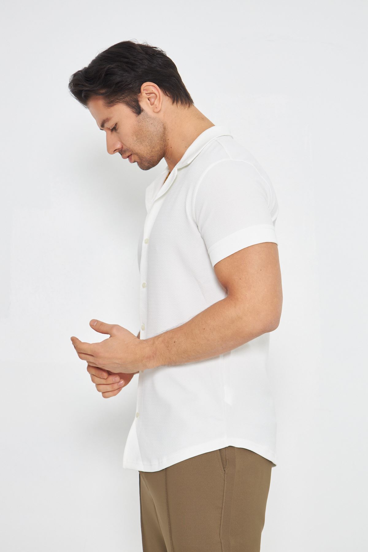 Erkek Örme Kumaş Düğmeli Apaçi yaka Şık Crep Desen Günlük Kullanıma Uygun Kısa Kol Gömlek