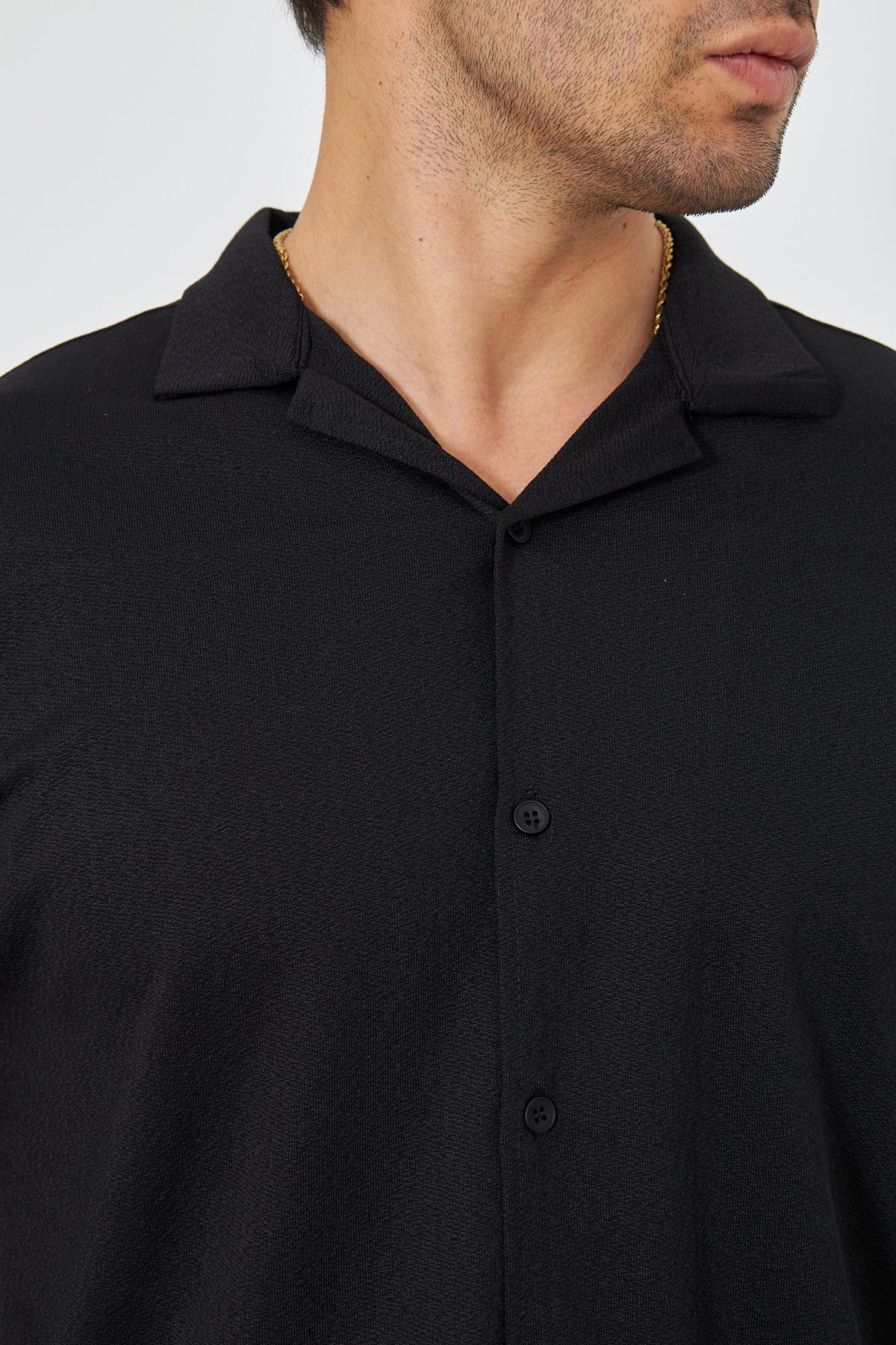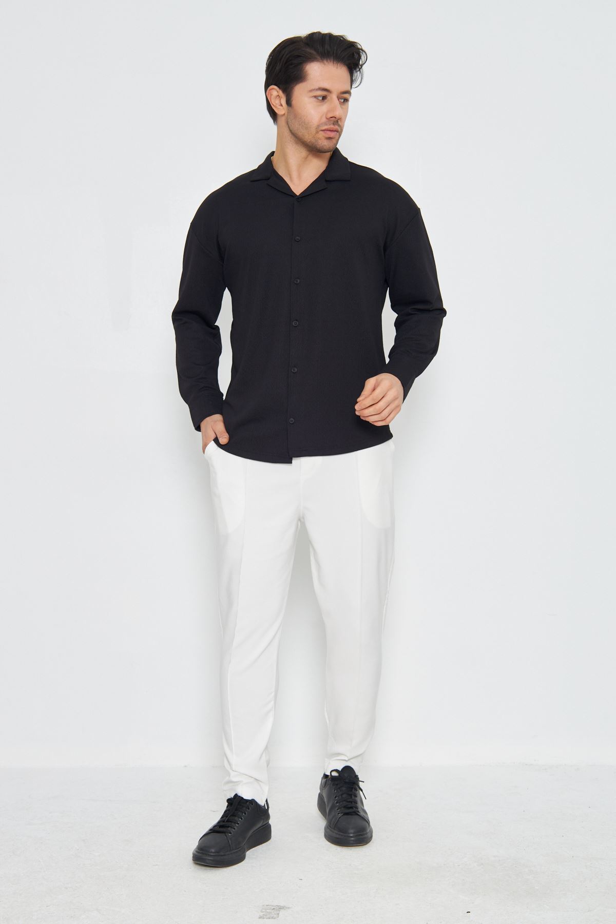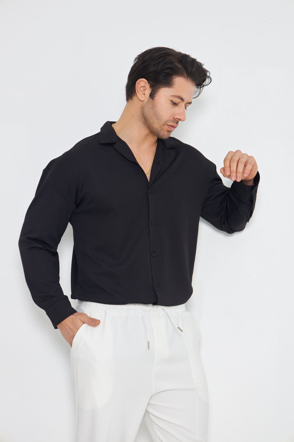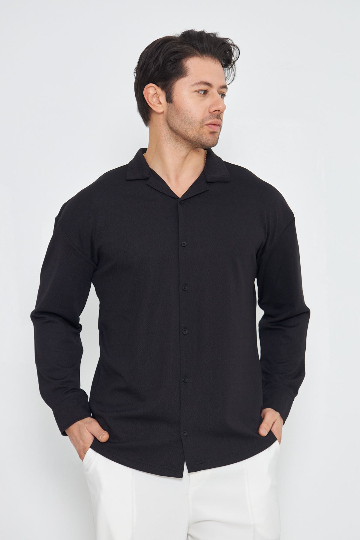 Erkek Yarım Oversize Uzun Kol Apaçi Yaka Ütü Gerektirmeyen Crep Desen Gömlek